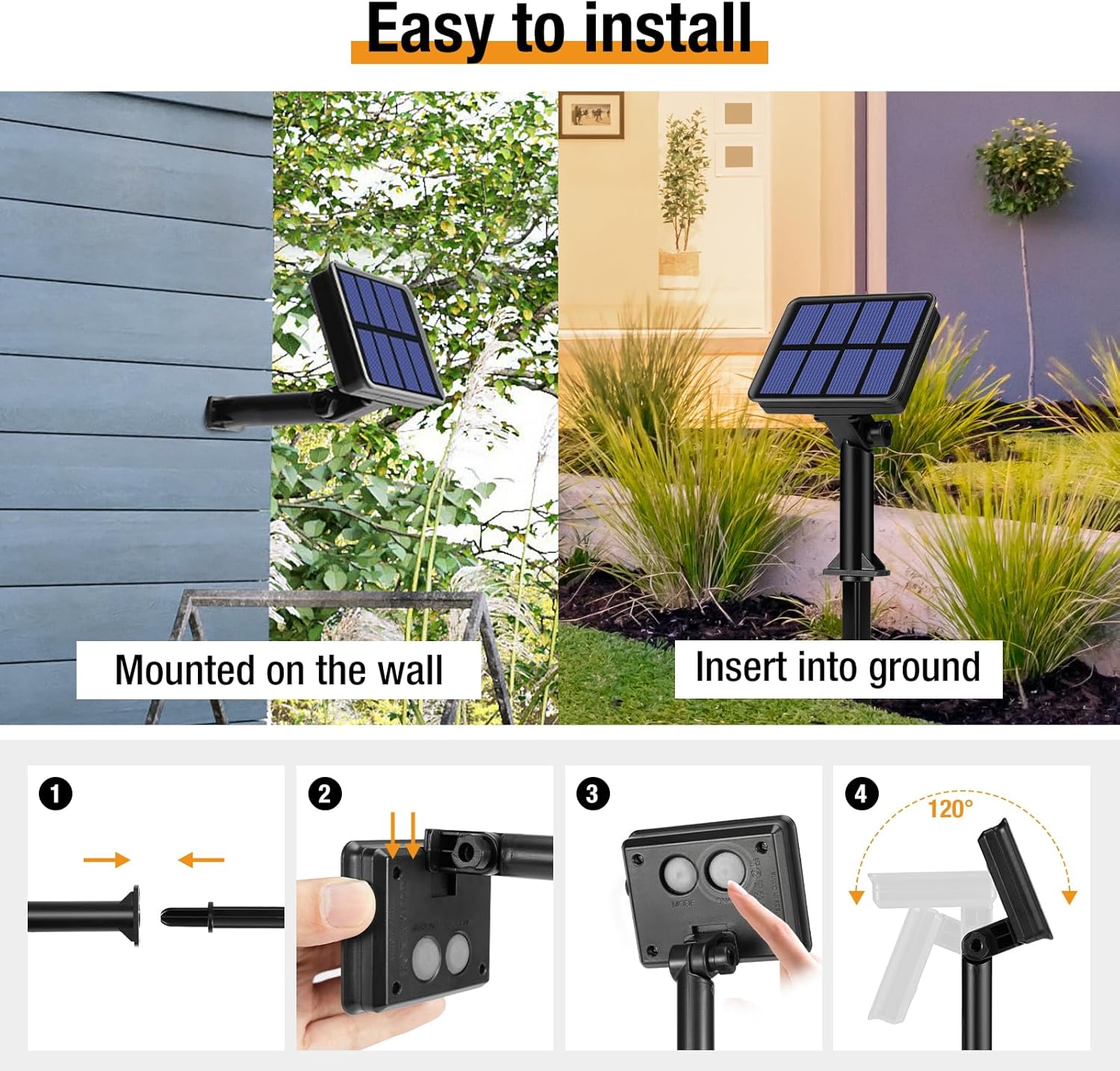 - ăHigh Efficiency & Auto On/OffăThe larger size of the new solar panel translates to a greater surface area for capturing sunlight, resulting in increased charging efficiency. That is to say the device can charge faster and potentially extend its usage time. Automatic full charge in direct sunlight for 6-8 hours and then automatically works for 10-14 hours (Note: charging and working time depend on the weather). Please press the ON/OFF button before charging.