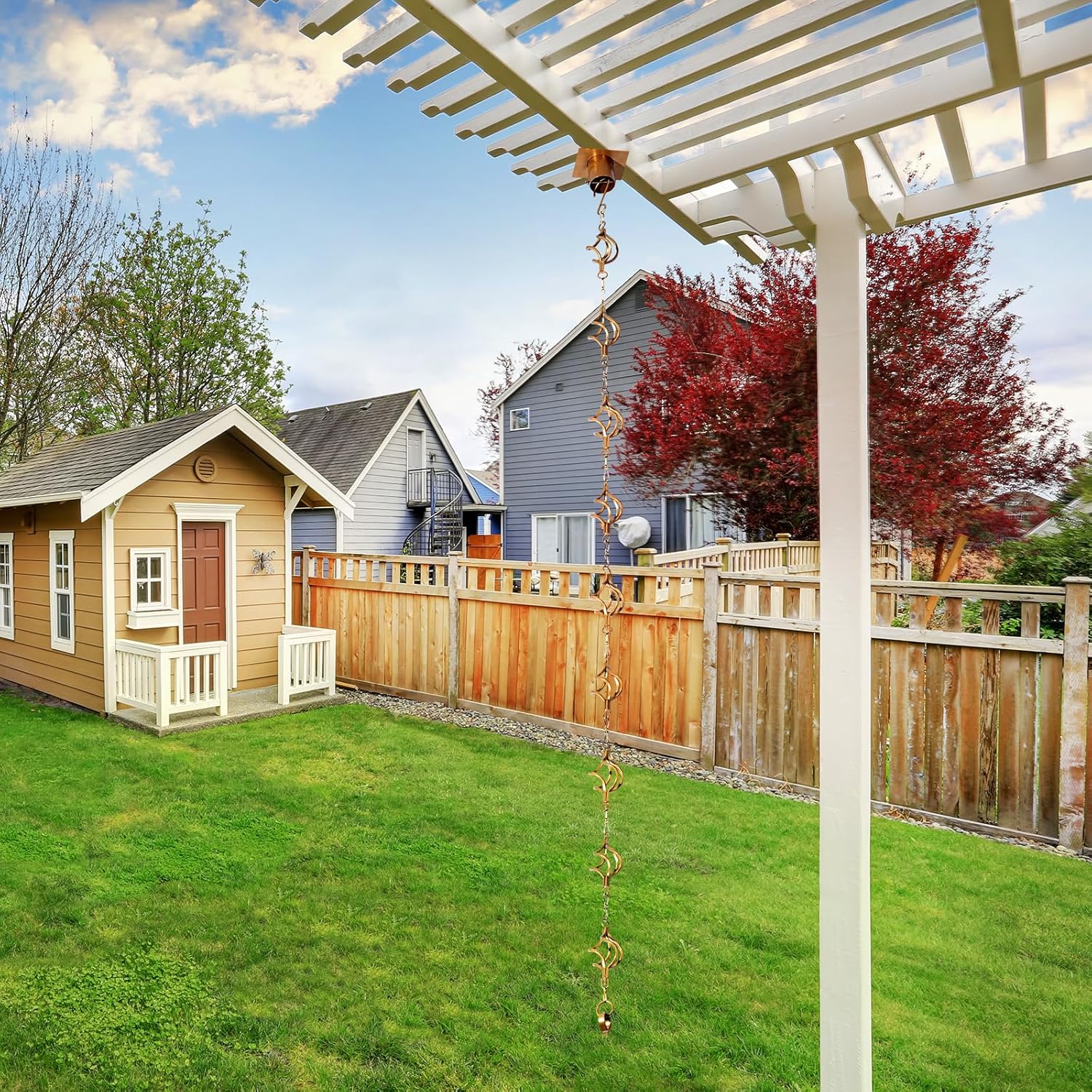 - Rain Chain Creative :A decorative item for gazebos, garden sheds and patios, and a great gift for gardening friends.If you don't exactly like copper rain chain what you've purchased, just return it for an easy refund.