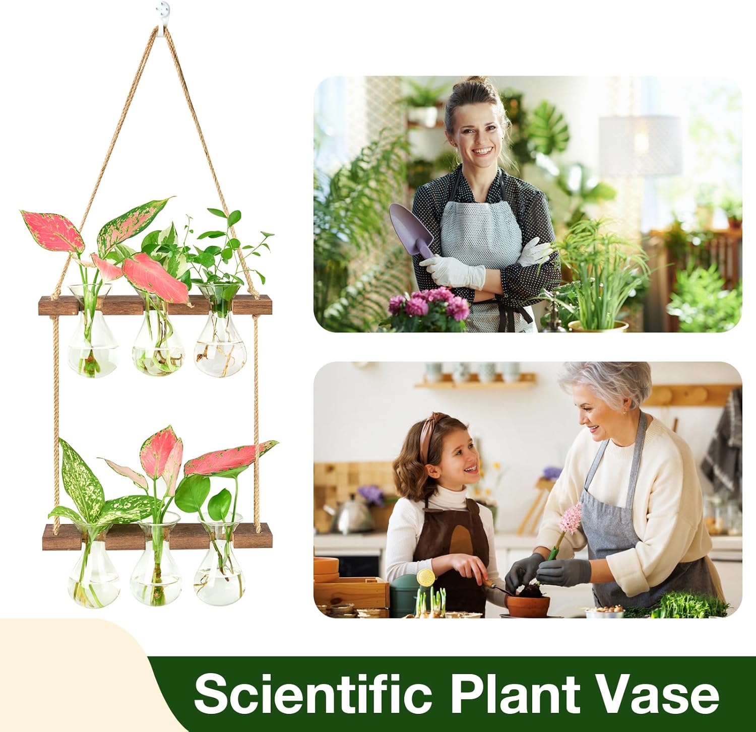 XXXFLOWER Wall Hanging Propagation Station with Wooden Stand 3 Bulb Vase 2 Tiered Planters Wall Terrarium for Home Office Plant Hanger Flower Vases Wall Decor(Brown)