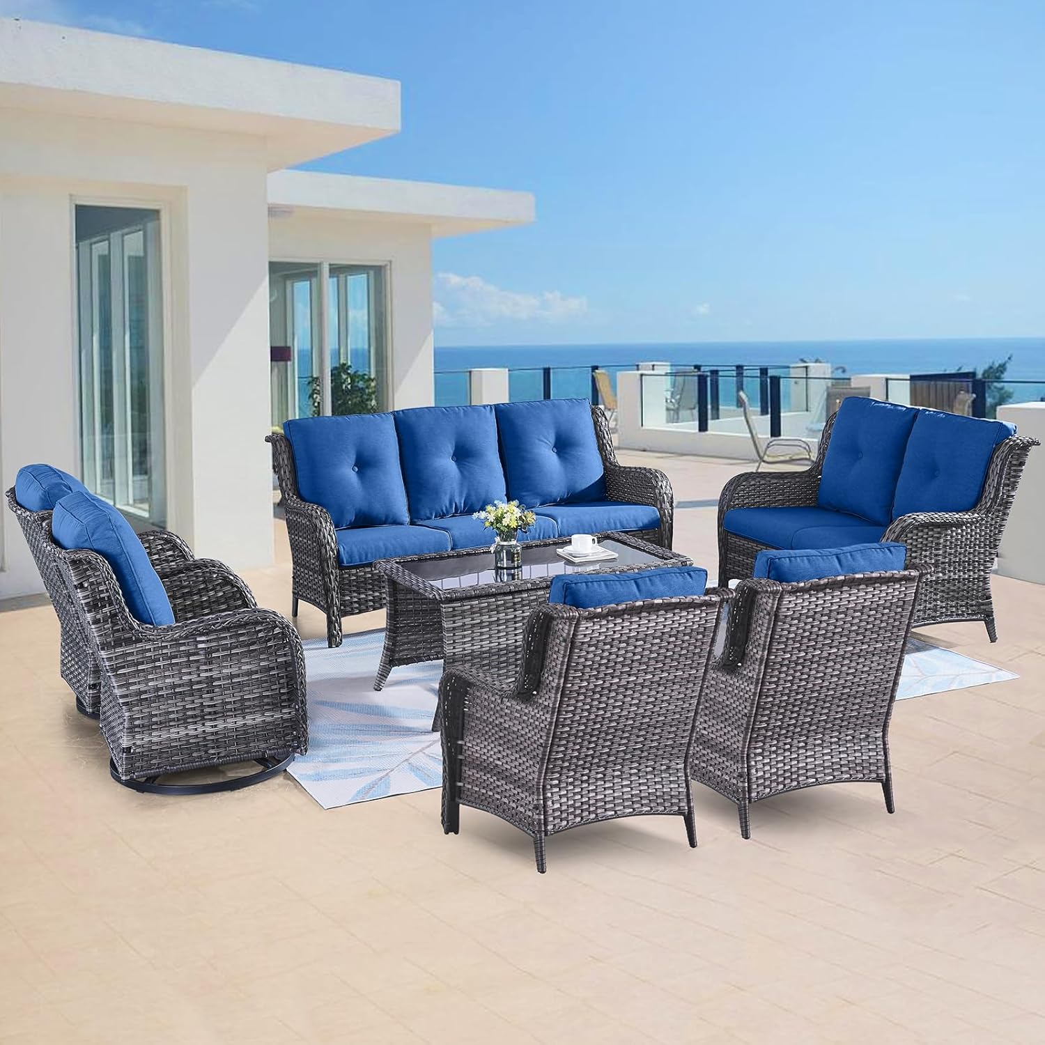 Outdoor Wicker Furniture Patio Set - 7 Piece Backyard Furniture Grey Rattan Conversation Sets with Swivel Rocker Chairs, Rattan Sofa, Club Chairs and Coffee Table, Blue Cushion