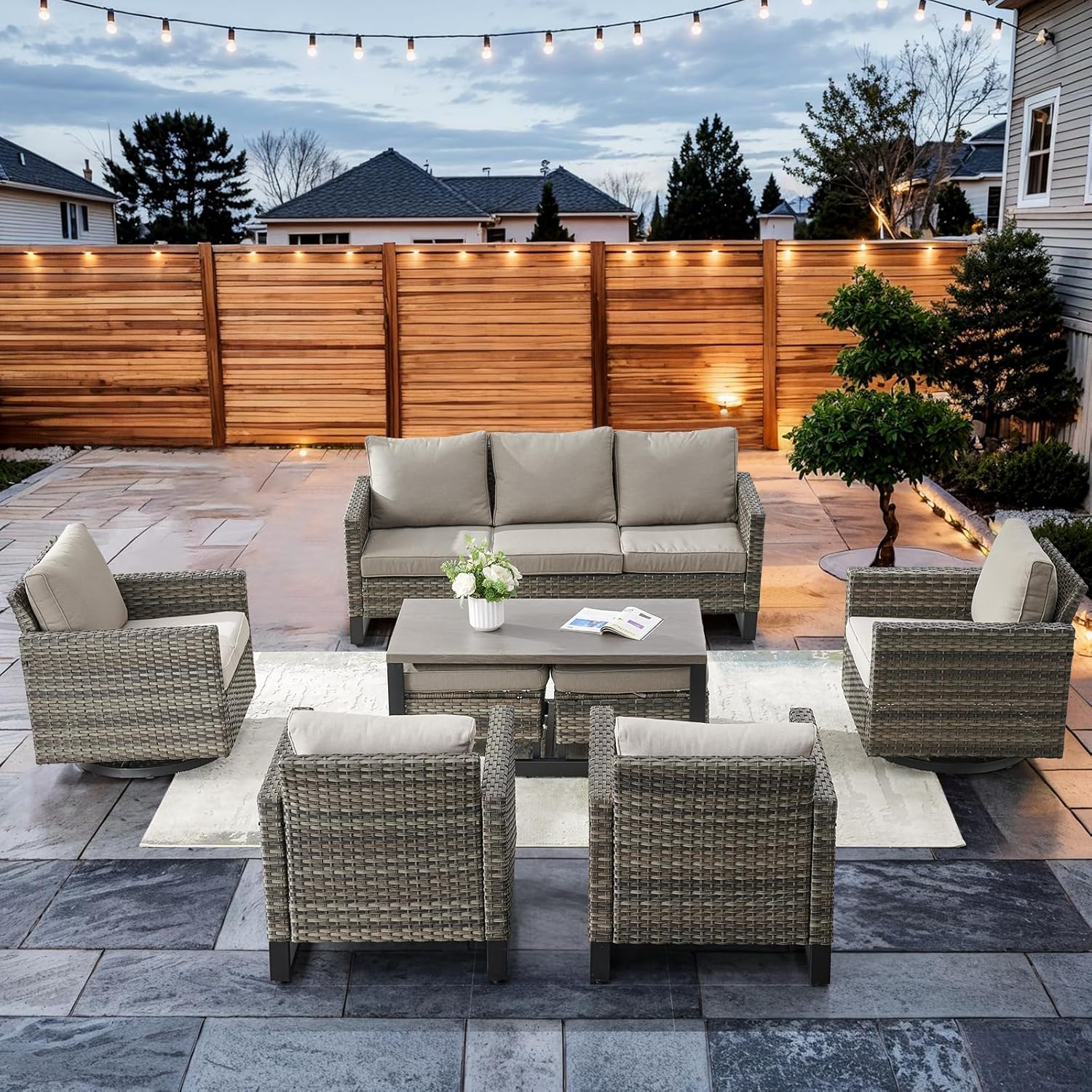 - 【Morden and Fashion】The popular grey wicker outdoor furniture set blends easily with garden or backyard arrangement and landscaping.Create an instant gathering spot on your porch or patio with this 7-person seating group,Including a large space dining table,a end table,You can enjoy delicious food or drink with your family and guests.