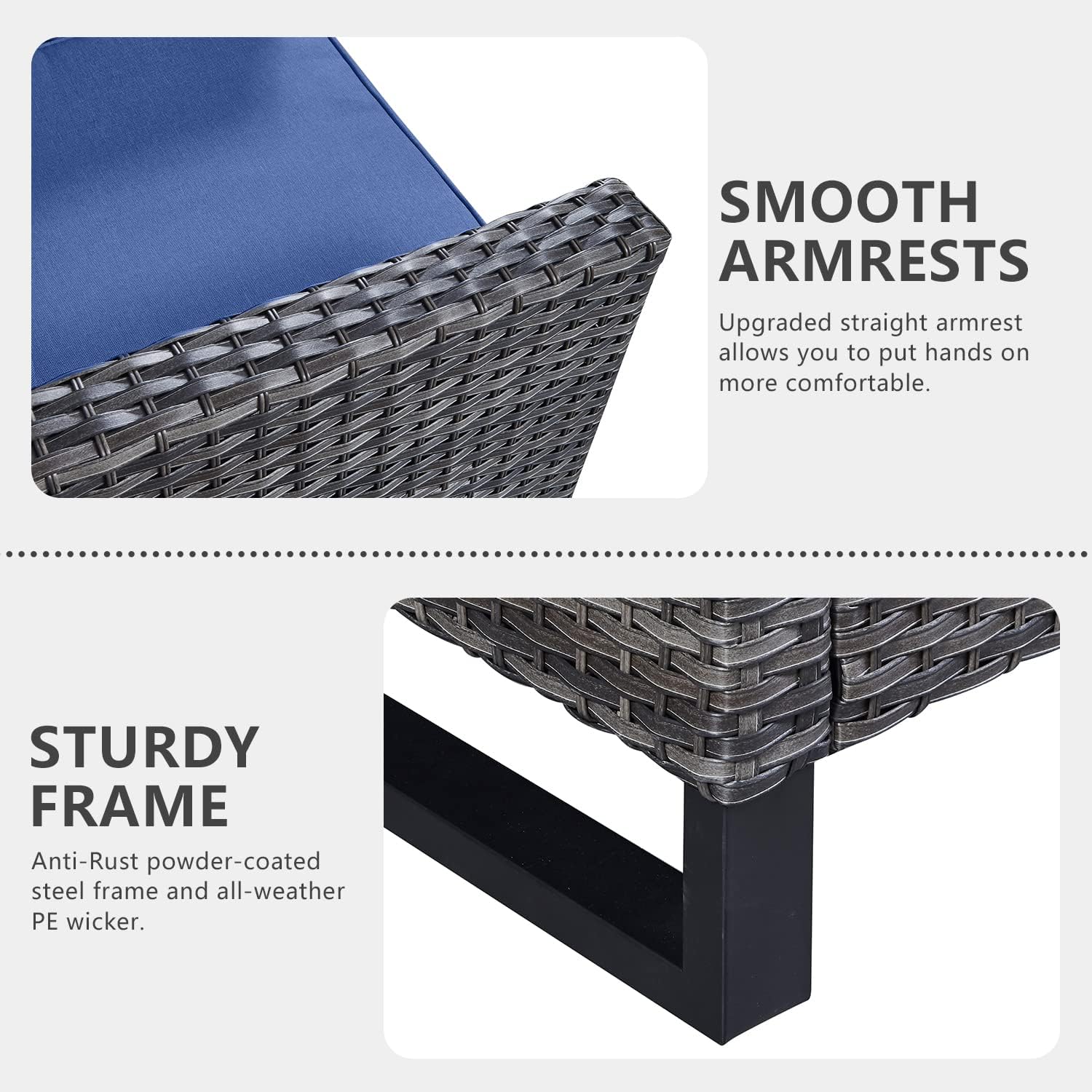 - 【Upgrated Elegant Design Sturdy&Durable】All made with Anti-Rust powder-coated steel frame and All-weather Hand-Woven PE wicker to make this patio furniture set is resistant to UV and weather,The patio conversation sets is totally upgraded with straight armrest and the heightened ergonomically curved backrest.