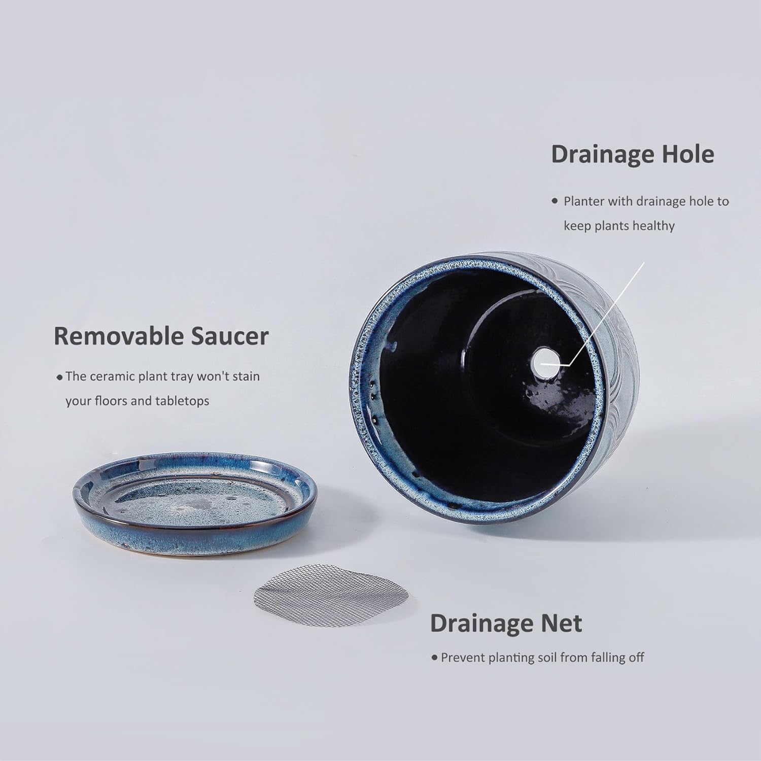 Ceramic Planter Pot, 5in, Reactive Glaze Blue, Indoor Outdoor Usage, with Drainage Hole and Saucer