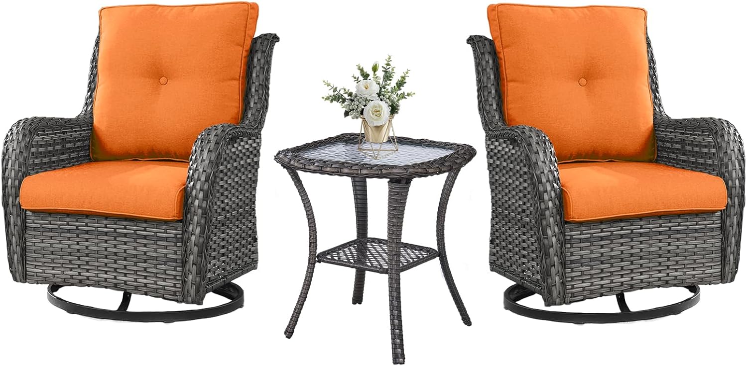 Outdoor Swivel Rocker Wicker Chairs Set of 3, High Back Swivel Patio Chairs Wicker Furniture Set, 2 PCS Rattan Swivel Rocking Chair with Side Table, Orange Cushion