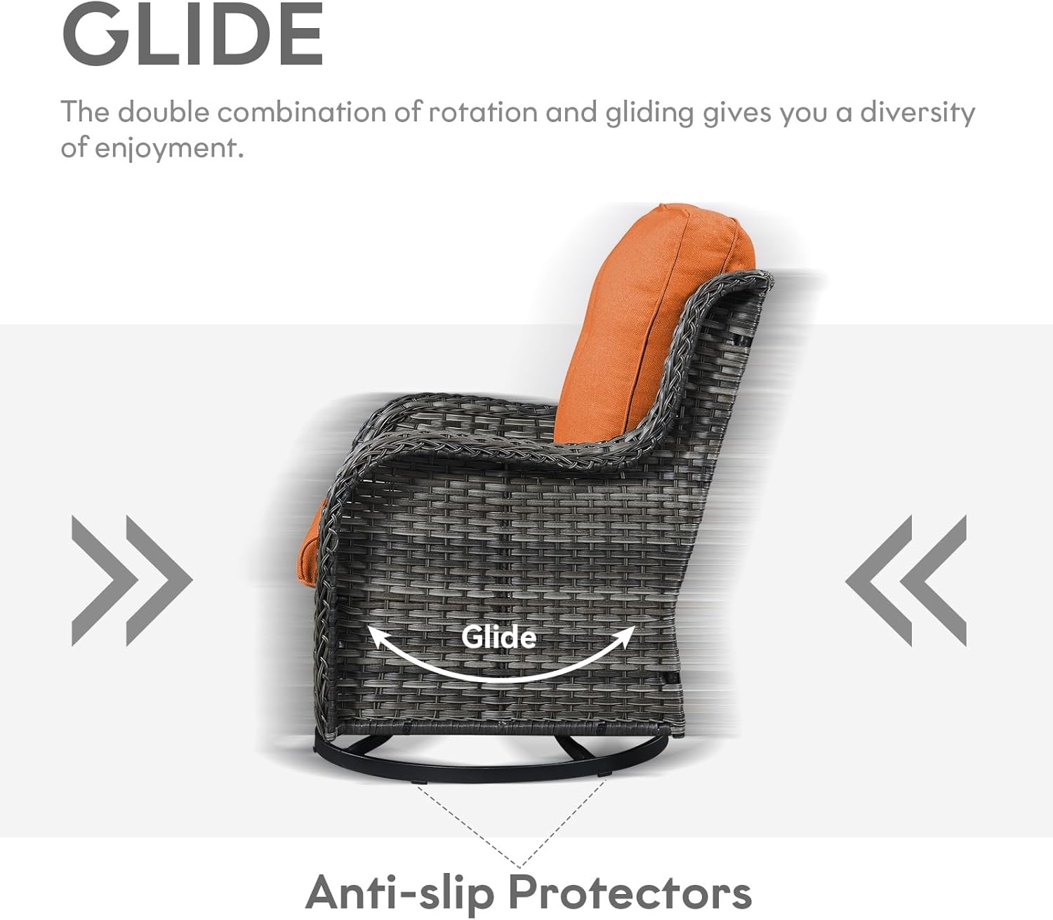 - 3.Multifunctional Patio Wicker Chair: The base of the swivel rocking chair is a dual-function disc base that can rotate 360 degrees and also glide back and forth, the operation will be very smooth. The swivel rocking chair is designed to help you sit more easily and comfortably, the base with a non-slip pad, so that the swivel rocker chair is more stable contact with the ground, do not worry at all that the chair will slide at will.