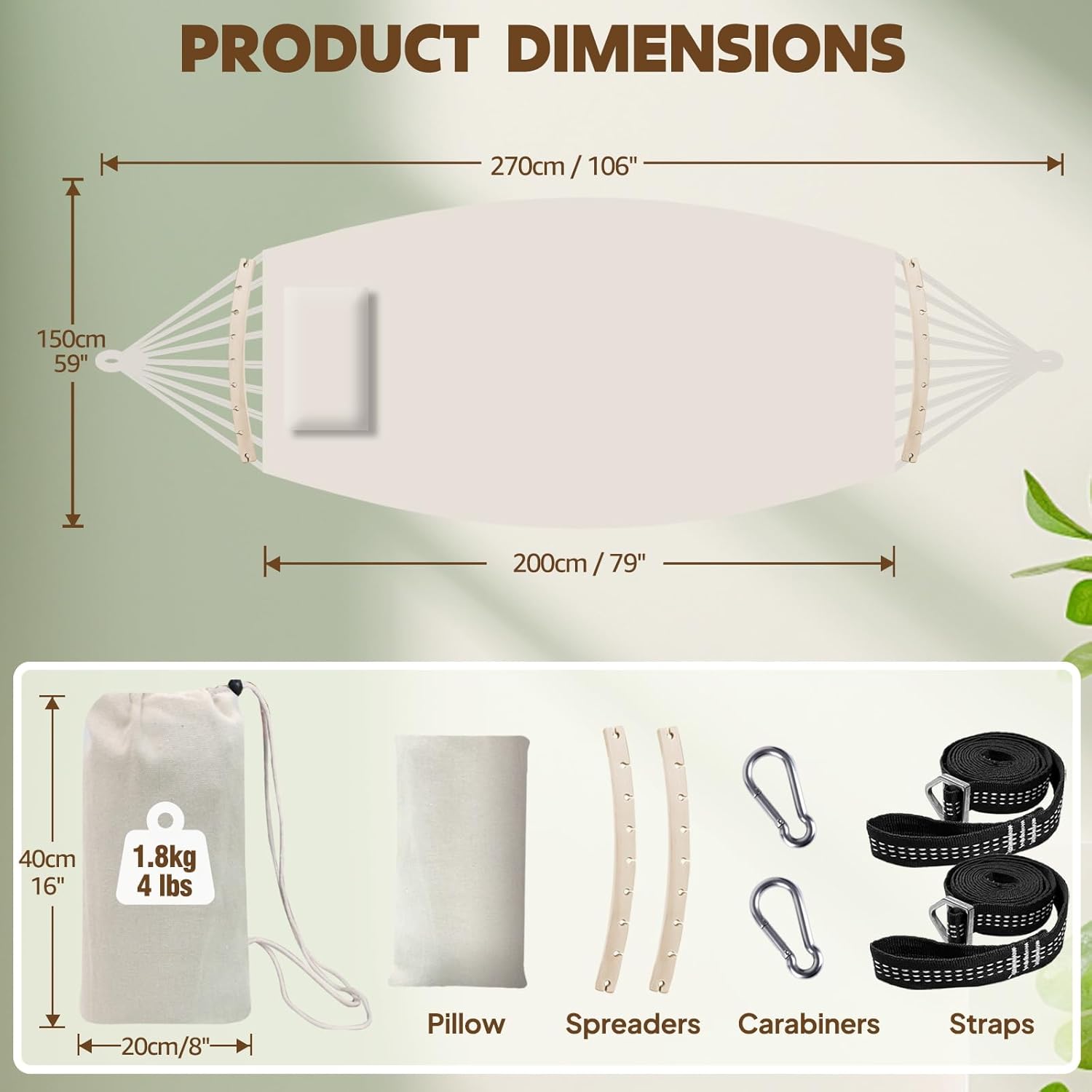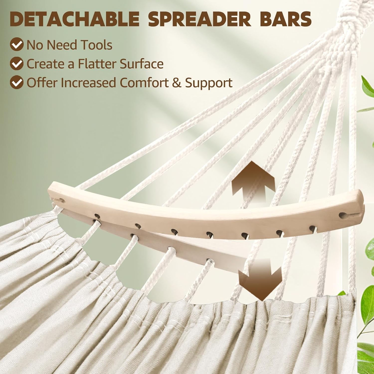 - Stability and Security:The spreader bars enhance stability, preventing excessive swaying or flipping,ensuring a secure and safe experience,especially when entering or exiting the hammock. With the included suspension system comprising two infinitely adjustable straps and two carabiners, you can easily and securely set up the hammock,promoting safe and enjoyable lounging.The suspension system's carabiners further enhance safety by offering reliable and secure attachment points.