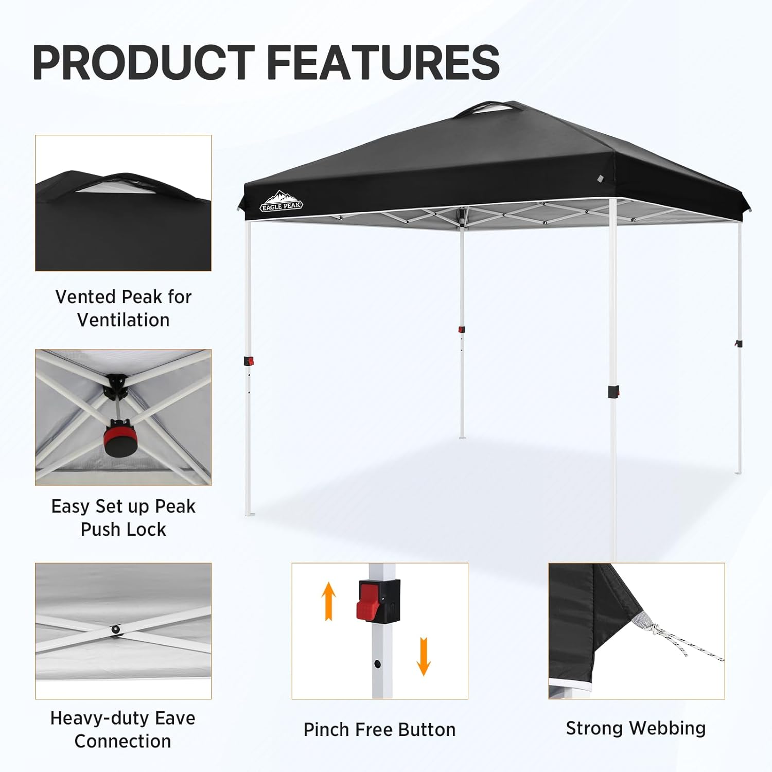 EAGLE PEAK Pop Up Canopy Tent with Wheeled Carry Bag, 8 Stakes, 4 Ropes, Easy Set Up Tent Canopy, 8x8 ft, Black