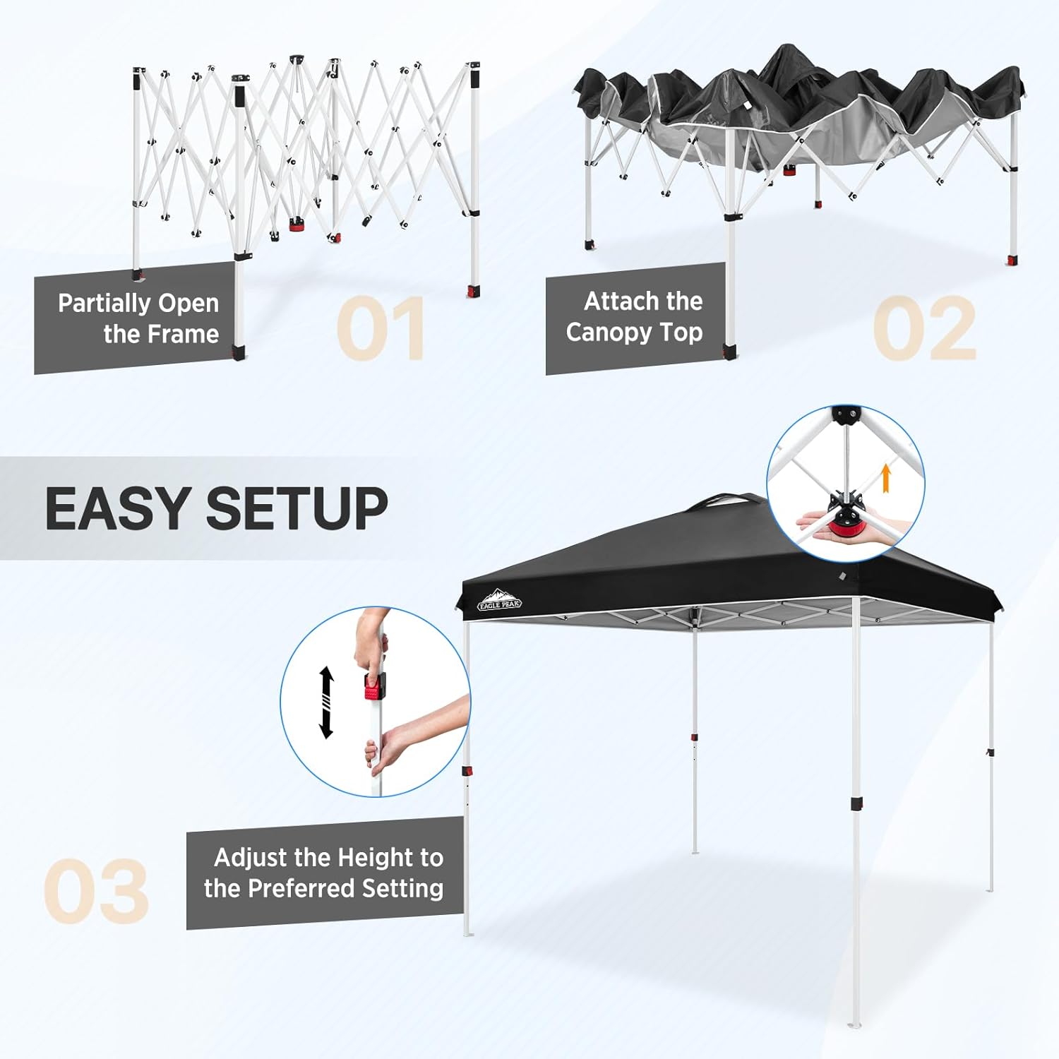 - EASY SETUP: This easy setup pop up canopy tent features the Peak Push system, a patented canopy center lock. The portable canopy requires no tools and easily opens and closes from the center in seconds. Its unique canopy tent center lock enables a quick, one person setup, letting you maximize outdoor time with minimal effort