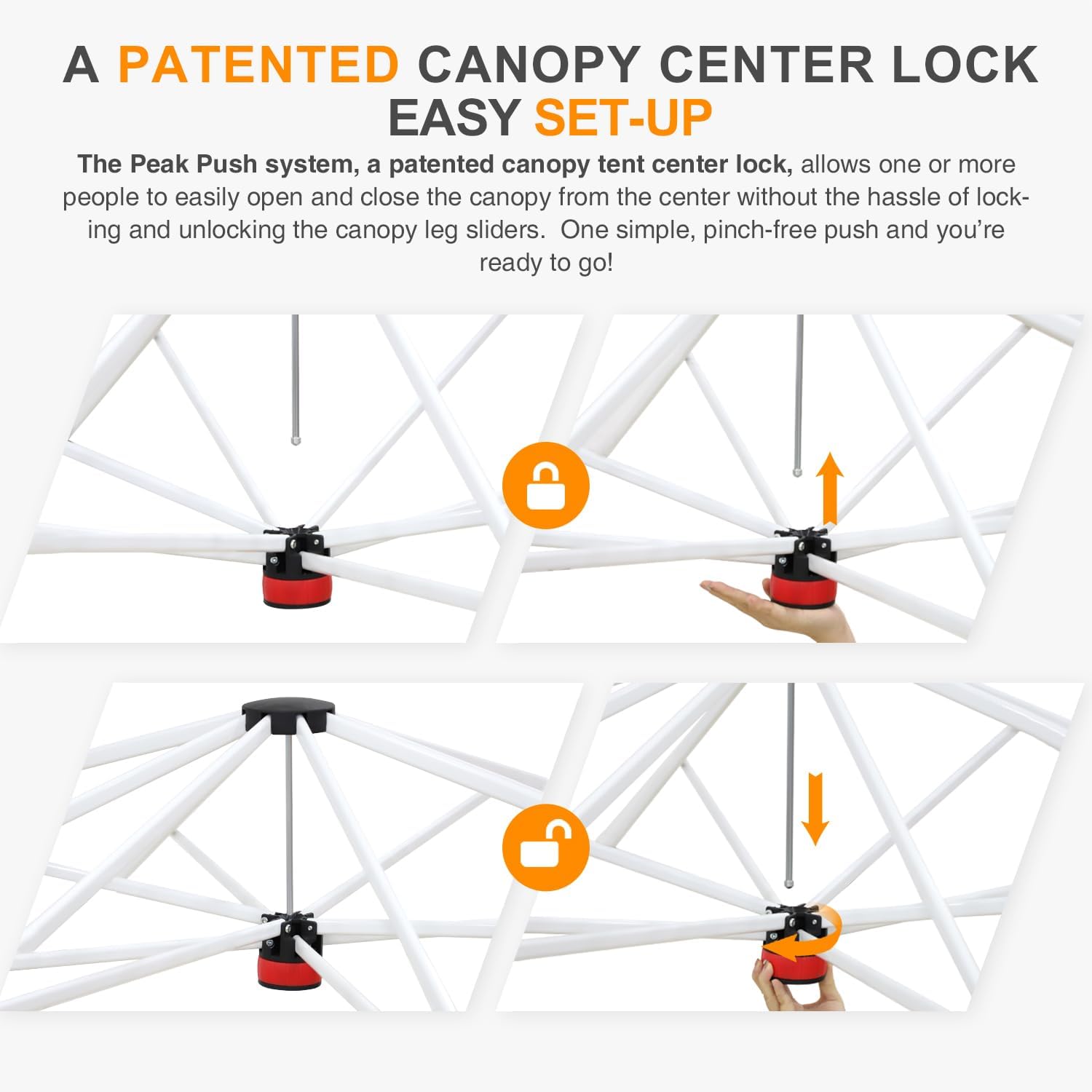 - EASY SETUP: This easy setup pop up canopy tent features the Peak Push system, a patented canopy center lock. The portable canopy requires no tools and easily opens and closes from the center in seconds. Its unique canopy tent center lock enables a quick, one person setup, letting you maximize outdoor time with minimal effort