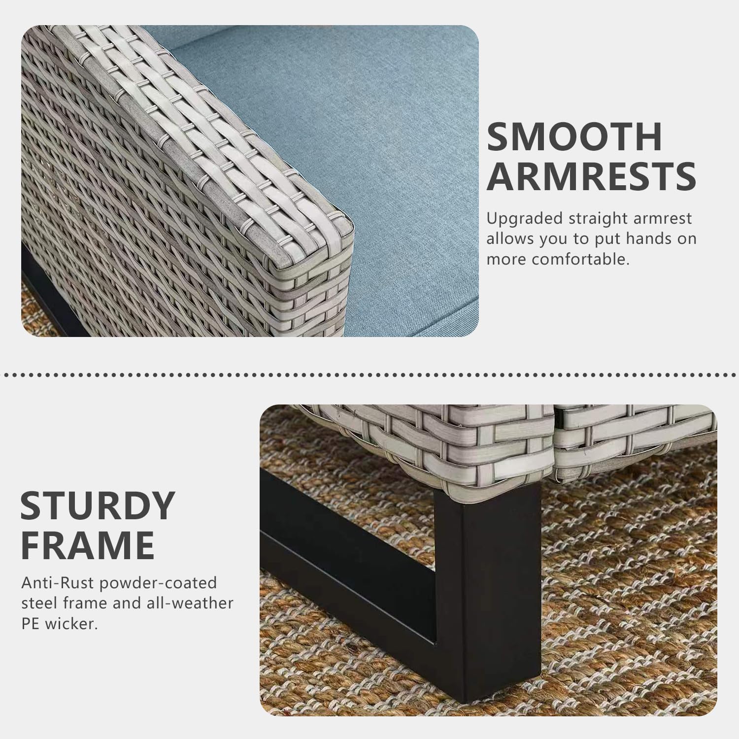 - 【Sturdy&Durable】All made with Anti-Rust powder-coated steel frame and All-weather Hand-Woven PE wicker to make this patio furniture set is resistant to UV and weather,The upgrated rectangle feet of couch and chairs which is firm and sturdy.