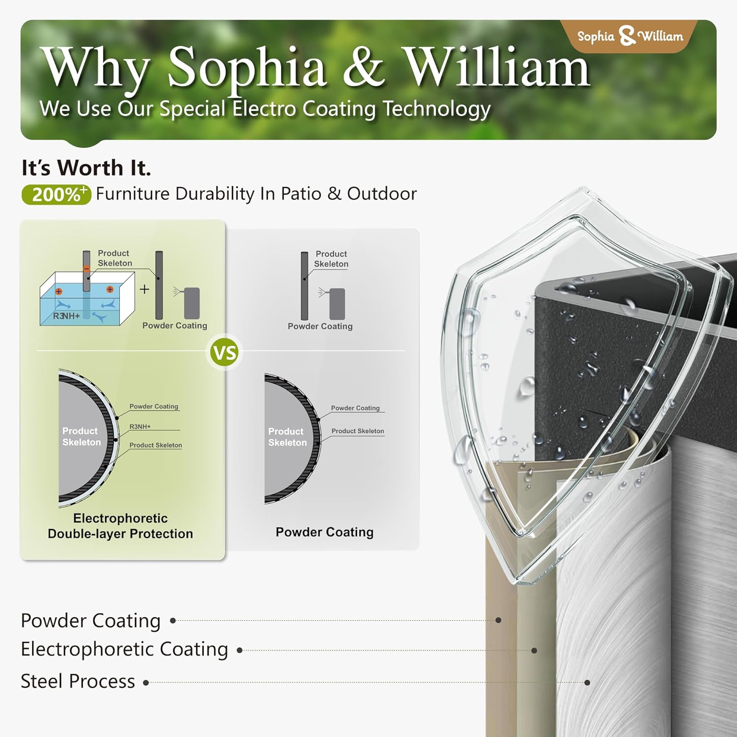 - All-weather Resistant :Sophia & William modern patio conversation set is built with thicken steel frame with E-coating for excellent rust-proof ability and and long-lasting. Steel slat cross bar on the bottom adds the stability and weight capacity up to 354lbs. With an steel frame, you'll get a clean look and create a luxurious outdoor living space for you and your guest