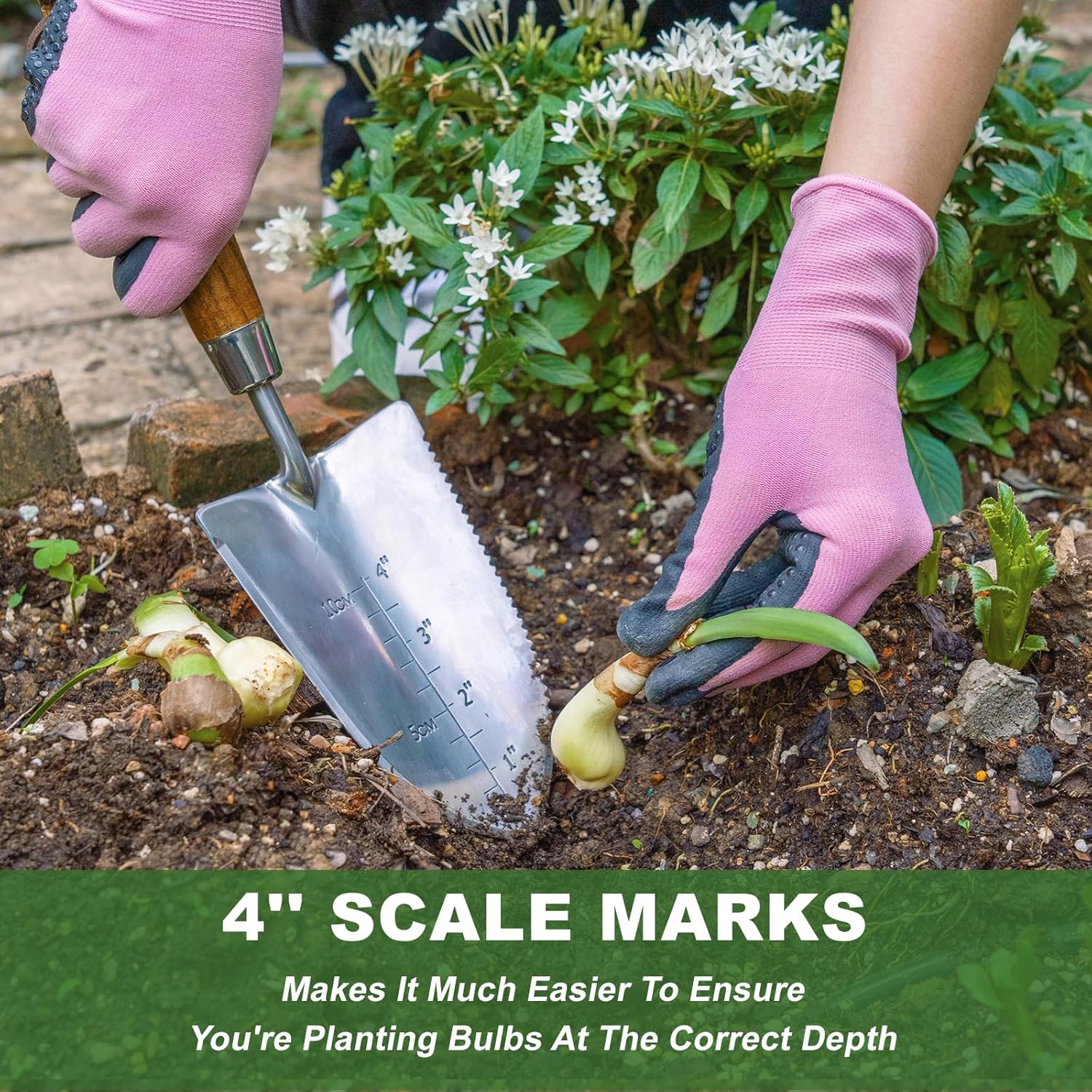 Haliaeetus Garden Trowel with Serrated Edge, 4'' Depth Marks Planting Shovel, V-Shaped Sharp Edge Garden Tool, Stainless Steel with Comfortable Wood Handle for Planting and Weeding