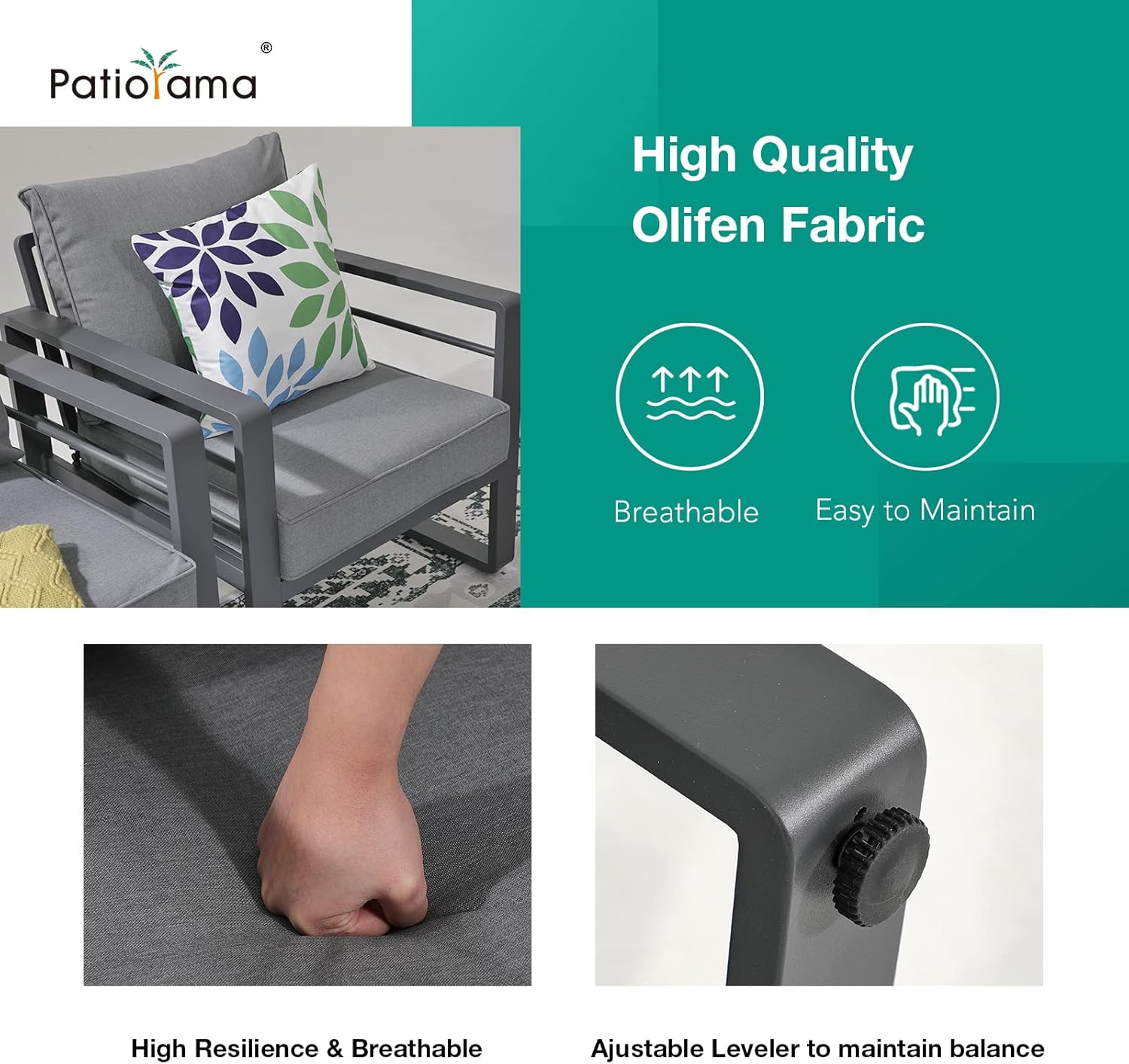 - [Superior Olefin Fabric]: The superior OLEFIN fabric, used on all cushions with extra binding design, adds a hint of outdoor luxury that will greet guests with a preview of your personal style and hospitality. The 4-in thick foam cushions with removable and cleanable cushion covers ensure maximum comfort while maintaining their original full shape. All materials are treated to resist weather, rust, and UV fading throughout the year and easy to maintain. (Note: Cushions are non-waterproof.)