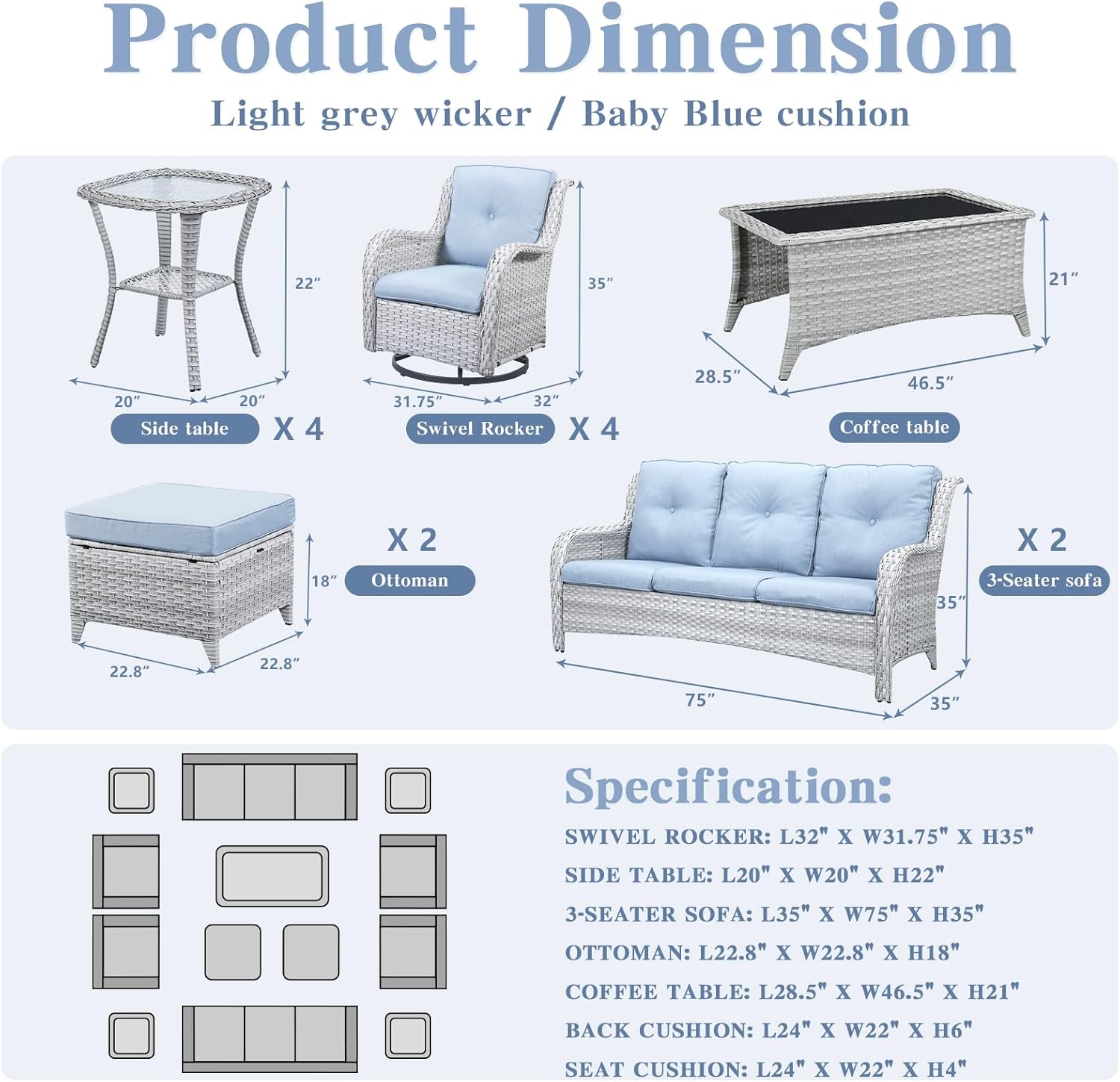Wicker Patio Furniture Sets - 13 Piece Outdoor Rattan Furniture Conversation Sets with 4 Swivel Rocker Chairs, 2 Rattan Sofas, Wicker Ottomans and Coffee Table, Light Grey/Baby Blue