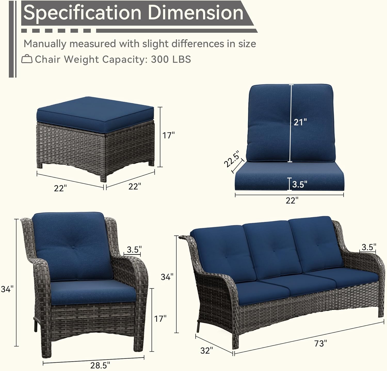 Patio Conversation Set 5-PCS Wicker Outdoor Furniture Conversation Set with 3-Seat Sofa, 2 Armchair, 2 Ottoman Patio Rattan Wicker Sectional Sofa Set with Olefin Cushion, Blue