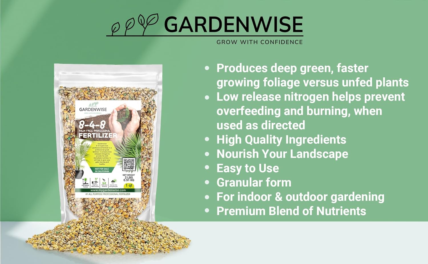 - 🌴 Optimal Nutrition for Palm Trees: With a balance of 8% nitrogen, 4% phosphorus and 8% potassium, Gardenwise’s robust 8-4-8 fertilizer expertly nourishes your palm trees! Enjoy new, vibrant and plush plume growth, creating a tropical paradise canopy!