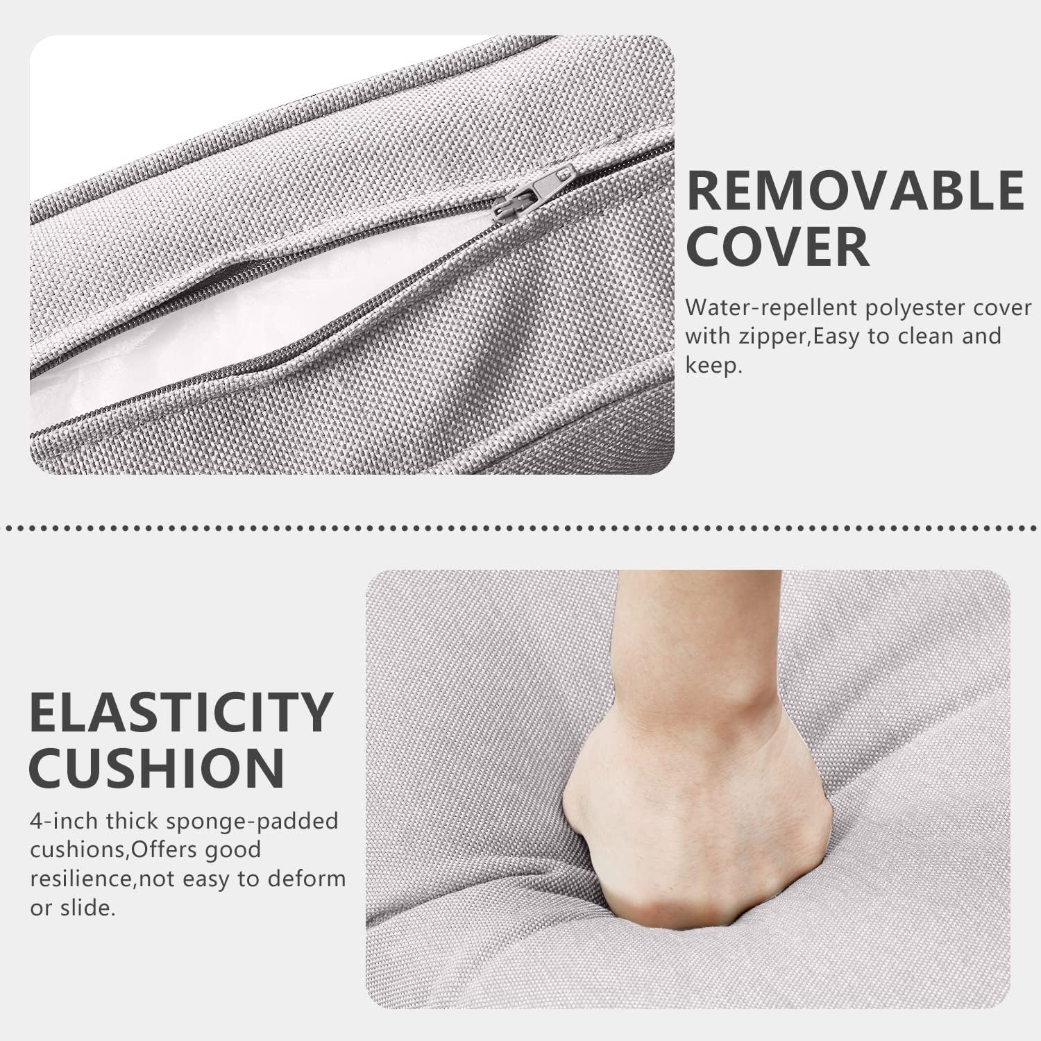 - 【Comfortable 4inch Thick Cushions】This outdoor furniture features deep and wide seats with 4-inch thick sponge-padded cushions,Offers good resilience, not easy to deform or slide, also protect your lumbar and offer a comfortable sitting experience.Water-repellent polyester cover with zipper,Easy to clean and keep.