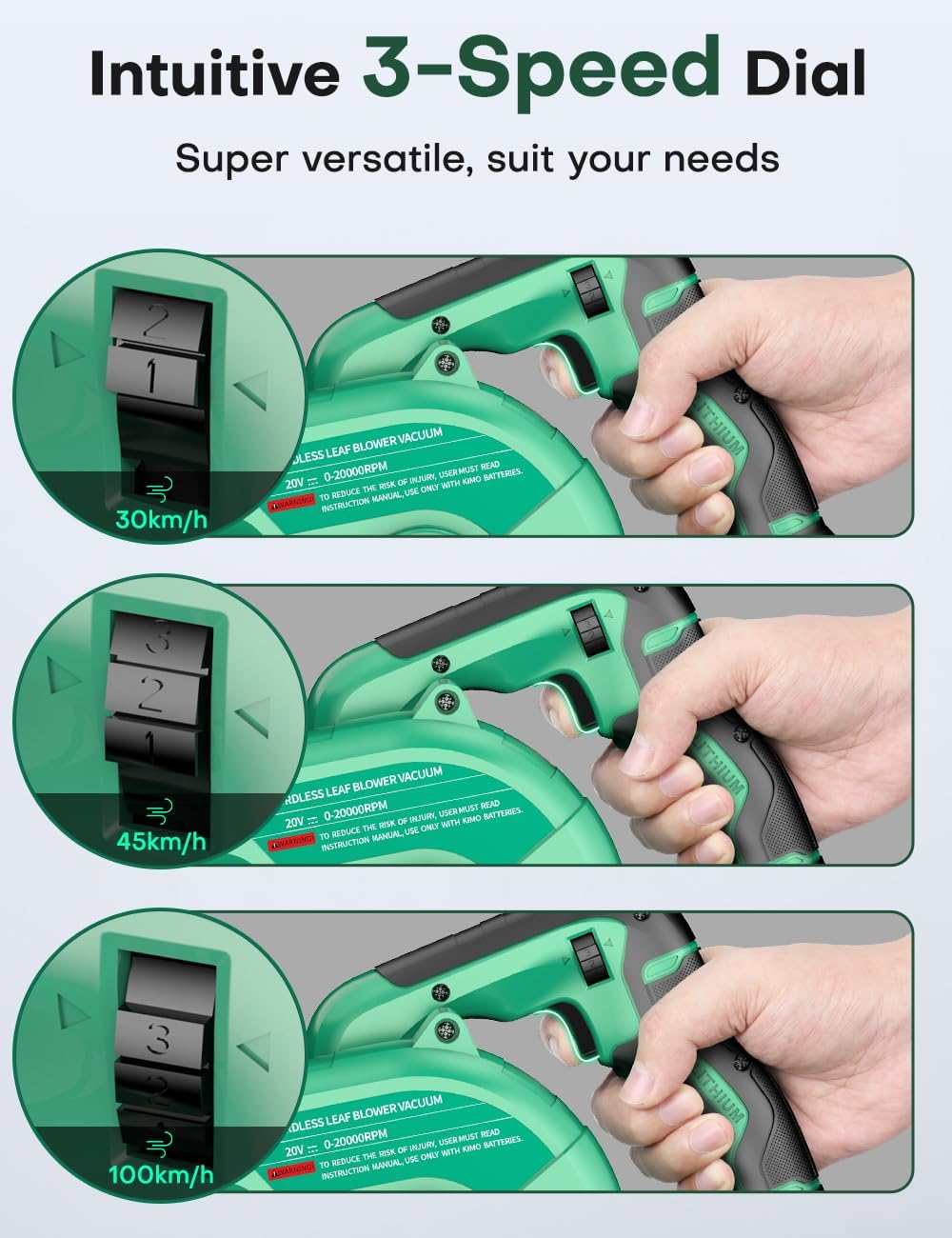 - 🍃【3 Variable Speeds】The cordless leaf blower with 3 variable speeds. Choose between 30km/h for delicate leaf cleaning work, and 45km/h for standard leaf cleaning, or unlock the full power at 100km/h for heavy-duty leaf blowing. Whether you have a small garden or a large lawn, the mini leaf blower is the perfect companion for all your outdoor maintenance needs.