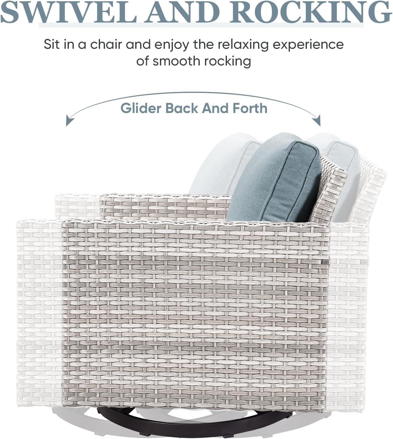 - ă360°Swivel Glider Rocker ChairsăDesign of rotating 360 degree,swinging back and forth,You can easily turn your face away from the sun without moving the entire chair, or swing your seat like a cradle for the ultimate relaxation while listening to music or watching your children play outside.