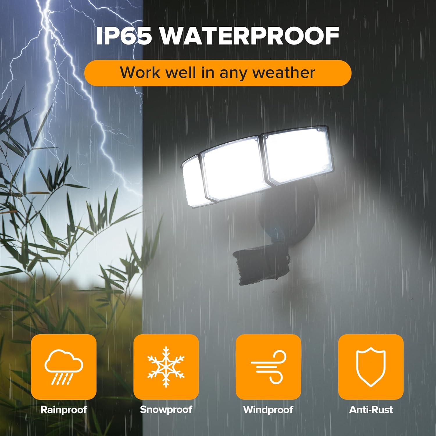 - Adjustable Design and Easy to Install: You can adjust the security light heads and the motion sensor head to different needs, which can provide extra brightness and more visible area. Coming with installation accessories, the security light can be be mounted on the wall in several wiring steps. IP65 waterproof rating ensures the light can work normally in severe weather