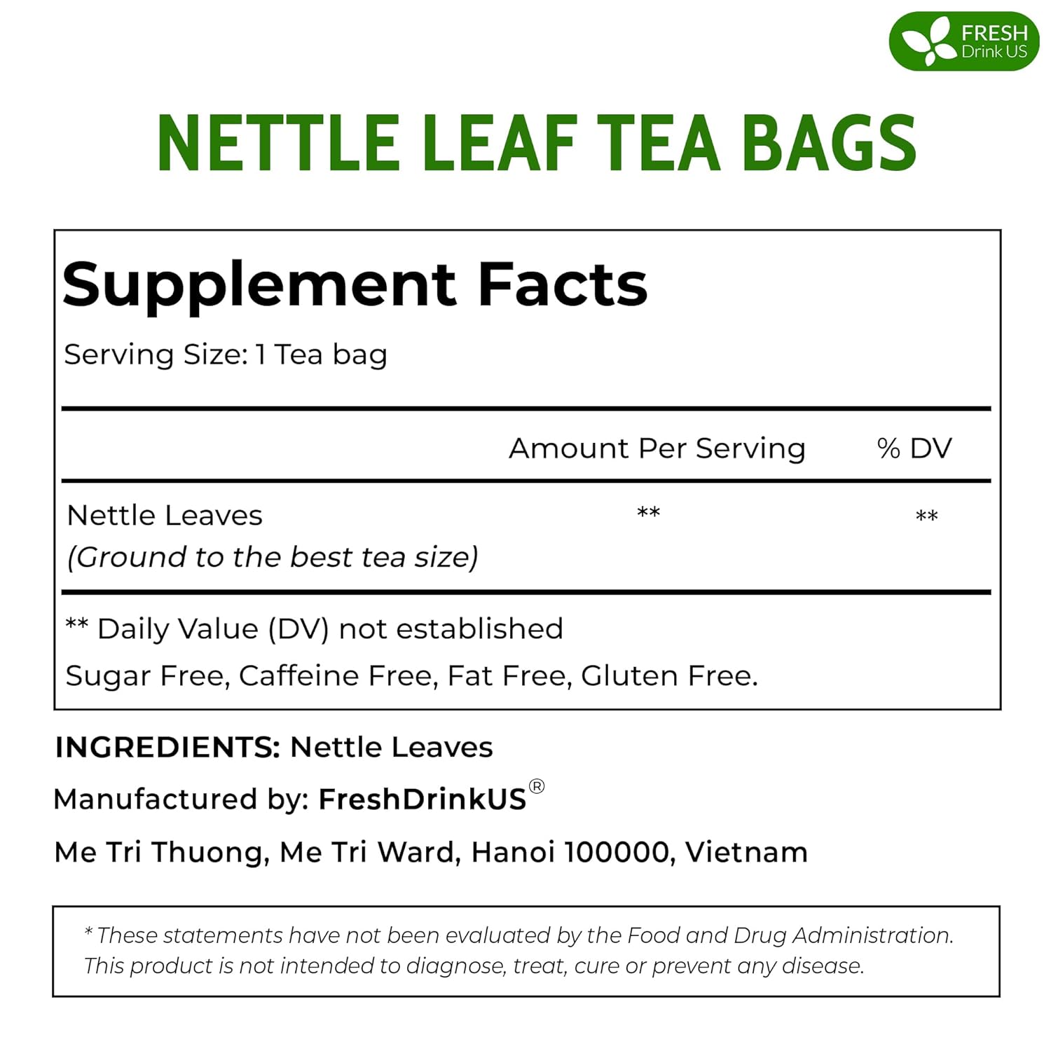 FreshDrinkUS, 30 Nettle Leaf Tea Bags, 100% Natural & Pure from Nettle Leaves. Loose Leaf Nettle Herbal Tea. Nettle Leaf Tea. No Sugar, No Caffeine, No Gluten, Vegan.
