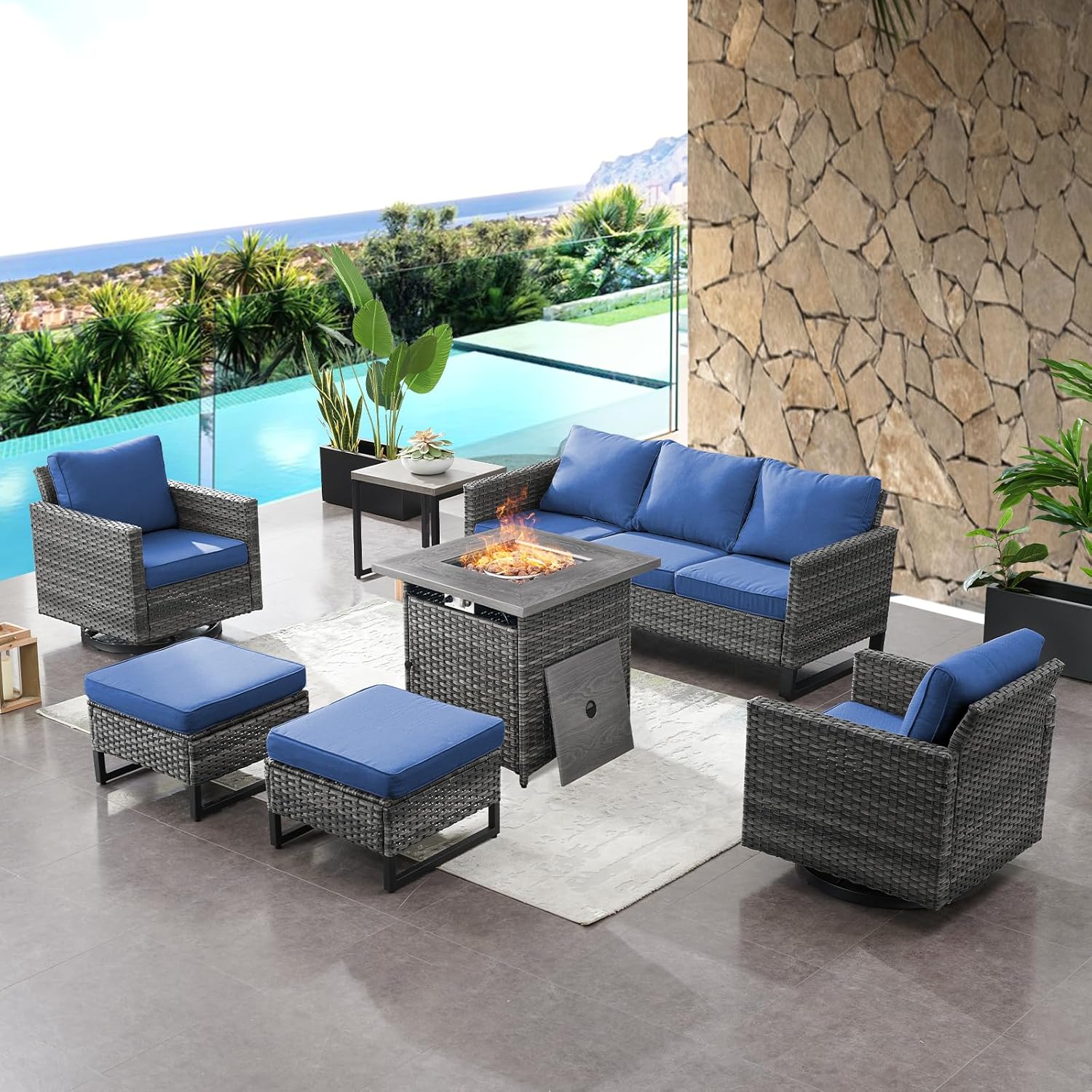 HUMMUH 7 Piece Patio Furniture with Fire Pit 30in 55,000 BTU,PE Wicker Outdoor Conversation Sets - Couch,Patio Swivel Chairs and Ottomans,Side Table for Porch,Garden,Backyard