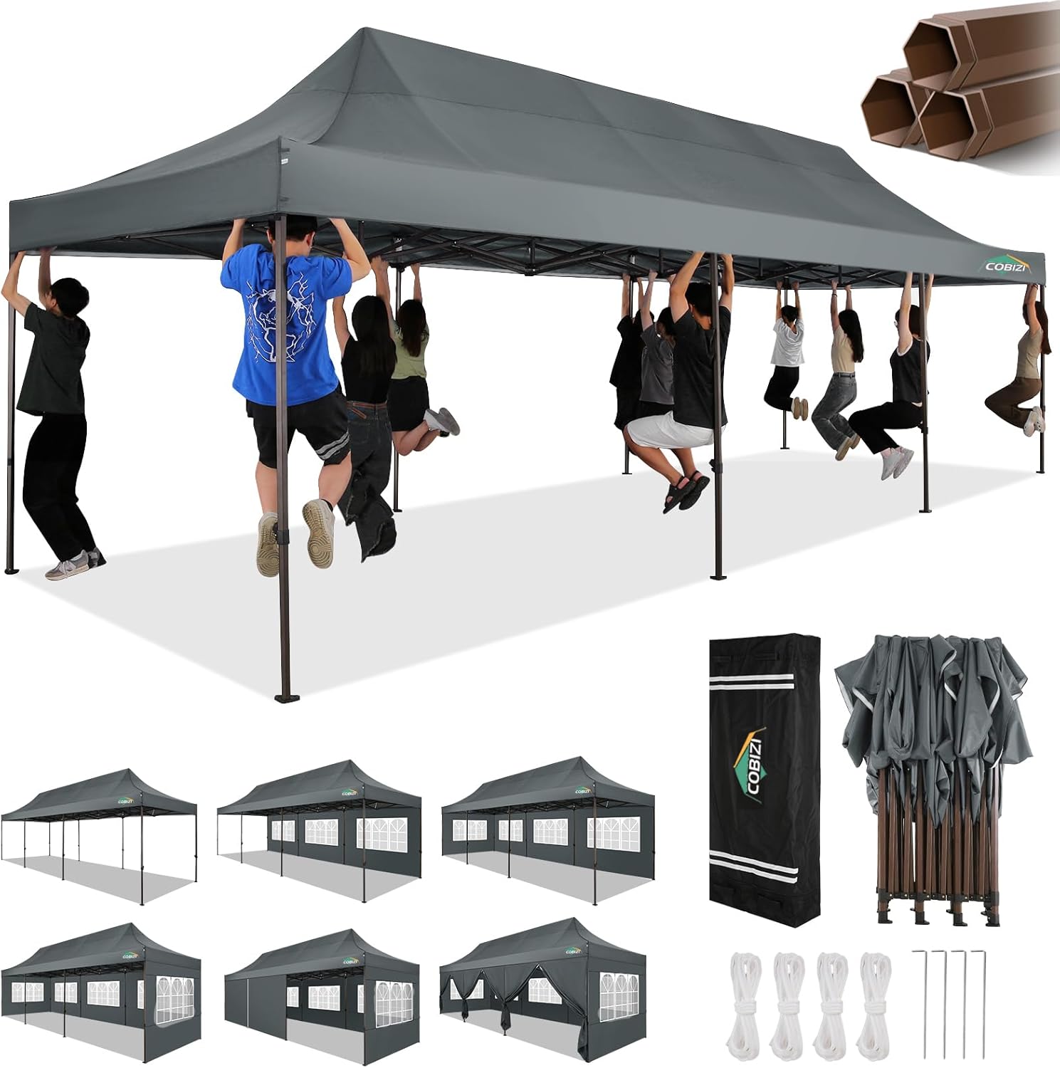 - 【Upgrade Heavy Duty Canopy】 The COBIZI 10x30 Heavy Duty Pop up Canopy features a commercial-grade full truss structure constructed from durable powder-coated stainless steel. The thickness of the 1.7 inch (45mm) hexagonal legs has been increased to 0.7mm/0.03 inches, providing superior stability and durability. Full truss design ensures exceptional sturdiness and rust resistance, capable of withstanding wind speeds of up to 30mph when properly secured with an number of ropes, and stakes.