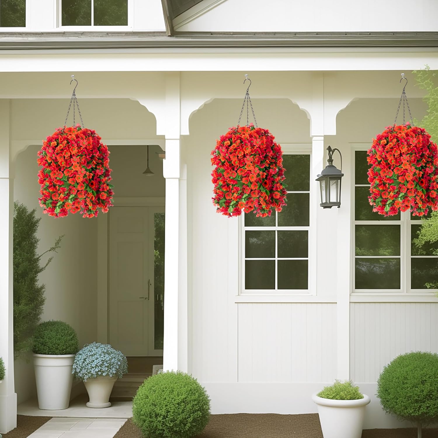 Artificial Hanging Flowers in 12 inch Basket, Fake Fall Plant Silk Orchid Flower Arrangement with Hanging Basket Daisy Planter for Patio Garden Porch Deck Summer Autumn Yard Decoration(Red Orange)