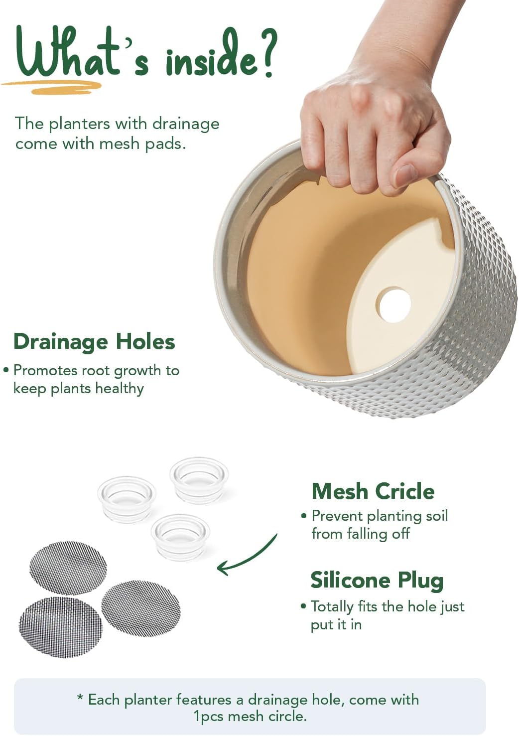 - Drainage Hole and Accessories: Each ceramic pots for plants features carefully designed drainage hole to maintain optimal soil moisture; the inclusion of silicone plugs and mesh pads provides added convenience, giving you flexibility in how you care for your plants