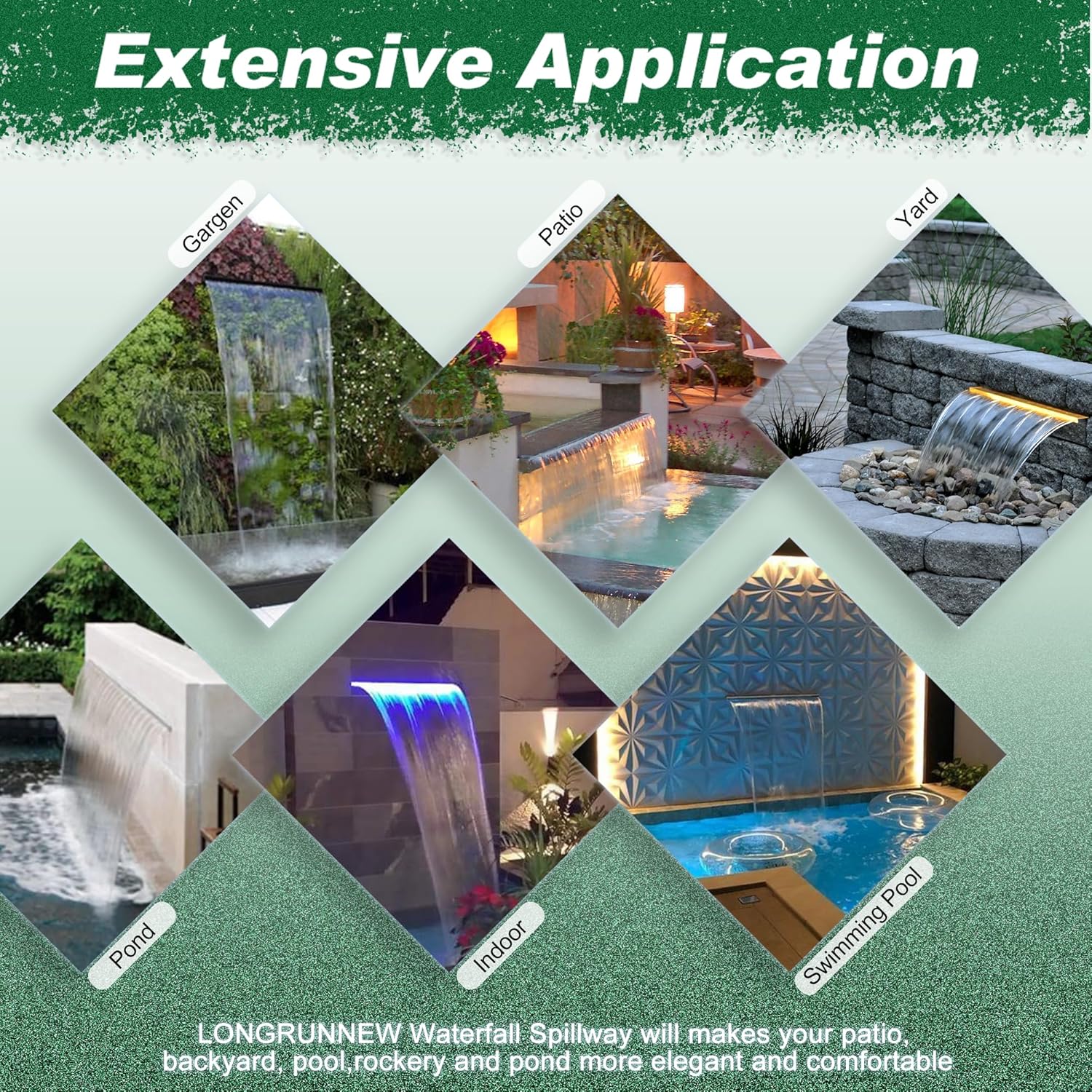• 【Garden & Pond Decoration Waterfall】- The LONGRUNNEW waterfall spillway lends decorative elegance and beauty to gardens and pools. With optional color-changing LED light strips sold separately, it creates a special ambience at night. The gentle sound of the cascading water enhances outdoor patios. Note that LED light strips are not included with the waterfall, but are available for separate purchase in our store.