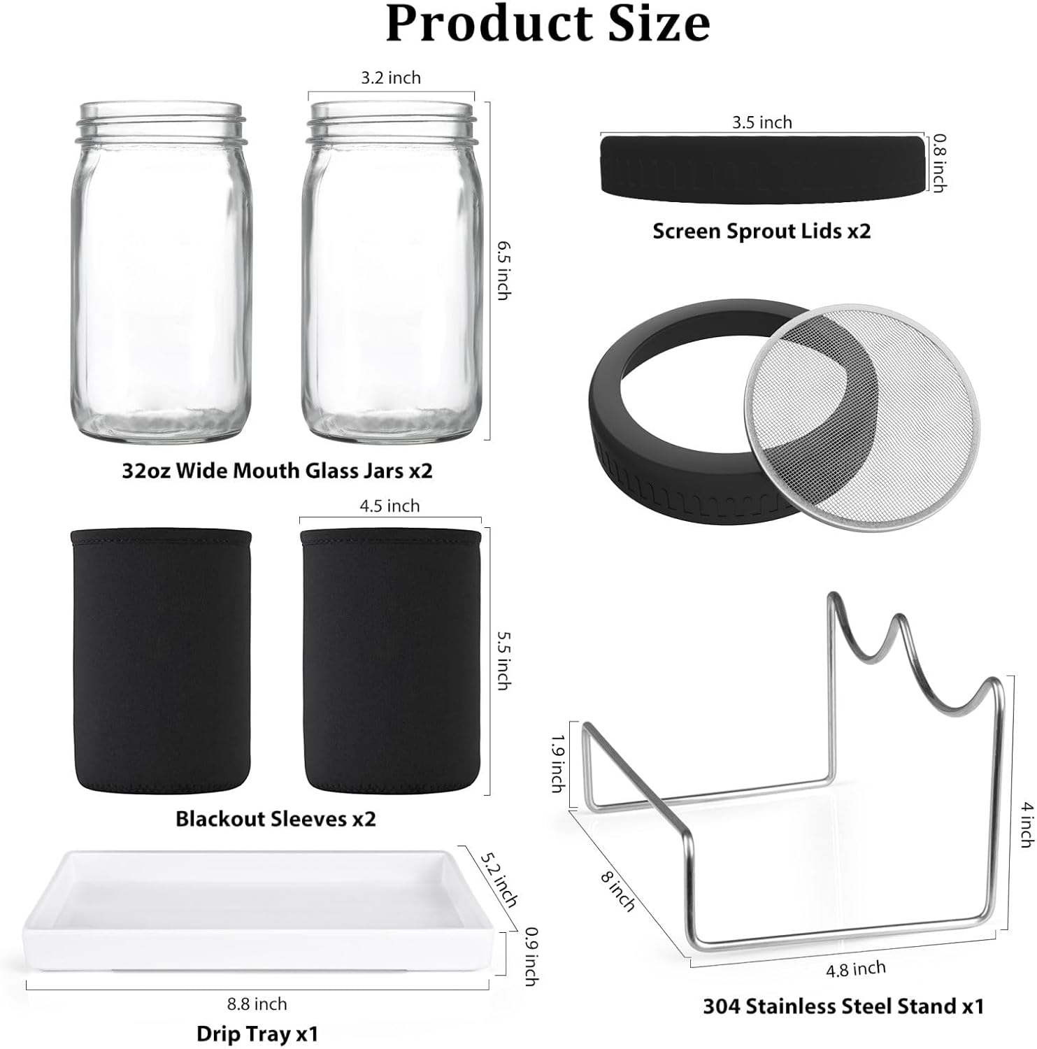 - COMPLETE SPROUTING KIT - Includes 2 Glass jars, 2 screen sprout lids, 1 stainless steel stand, 1 drip tray, 2 blackout sleeves.(SEED NOT INCLUDED)