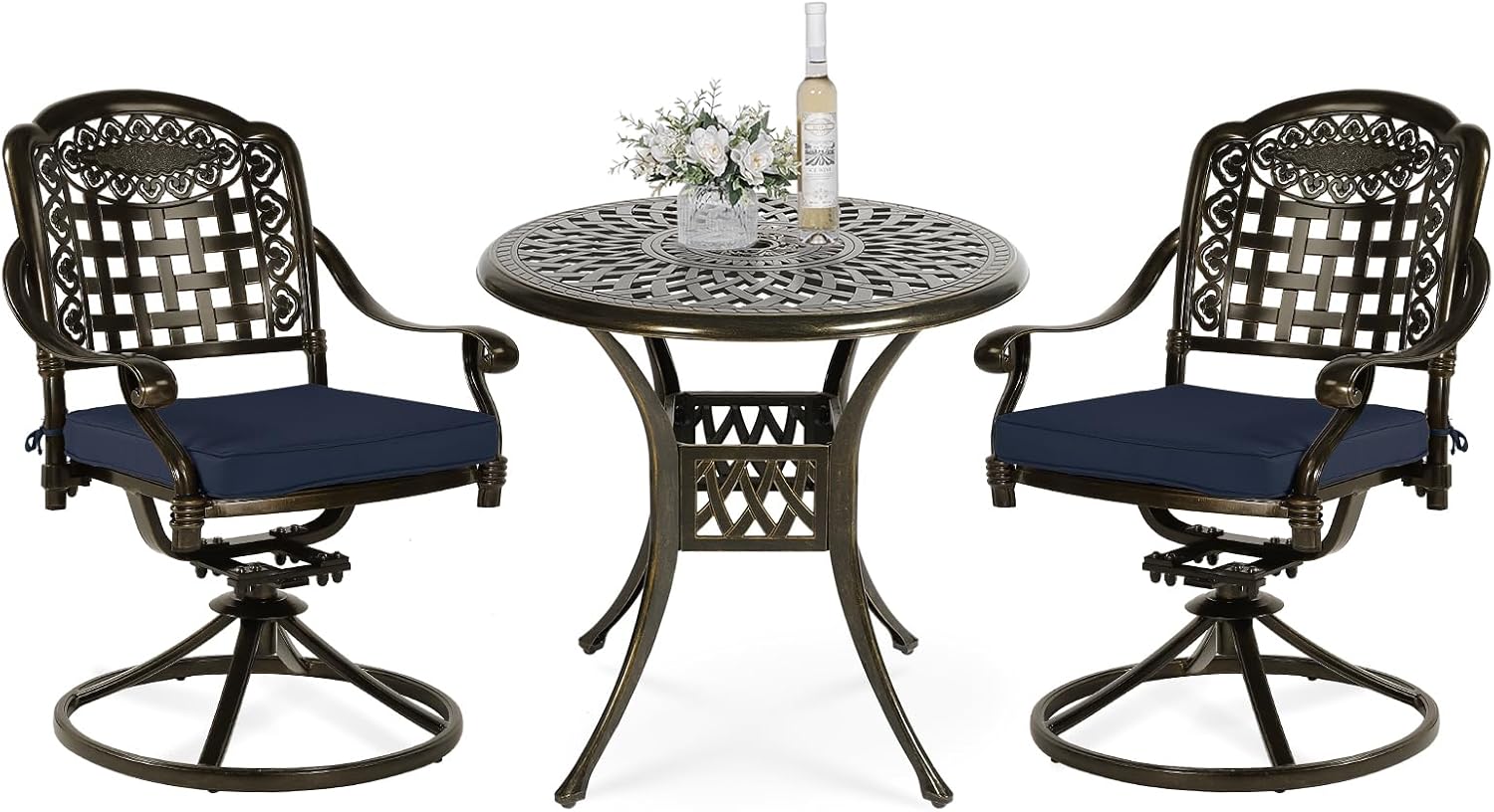 VIVIJASON 3-Piece Patio Bistro Set, Outdoor All-Weather Cast Aluminum Furniture Dining Set, Include 2 Swivel Chairs and 31" Round Table w/Umbrella Hole for Balcony, Lawn, Garden (Navy Blue Cushion)