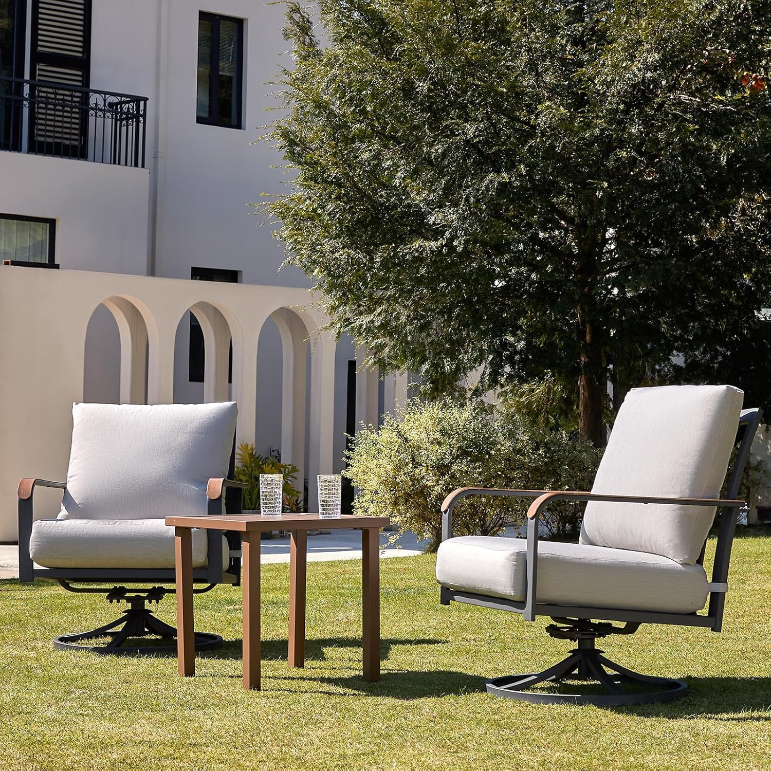 - 【Modern Unique Decor】This patio bistro set is designed to be modern and stylish,provide you a comfortable experience. The balance design of the rocking swivel chair is very good. Gently shake or rotate 360 degrees back and forth. Sway quietly to better relieve fatigue and stress, your family and friends could sit on the rocking swivel chair set and enjoy leisure time with you happliy.