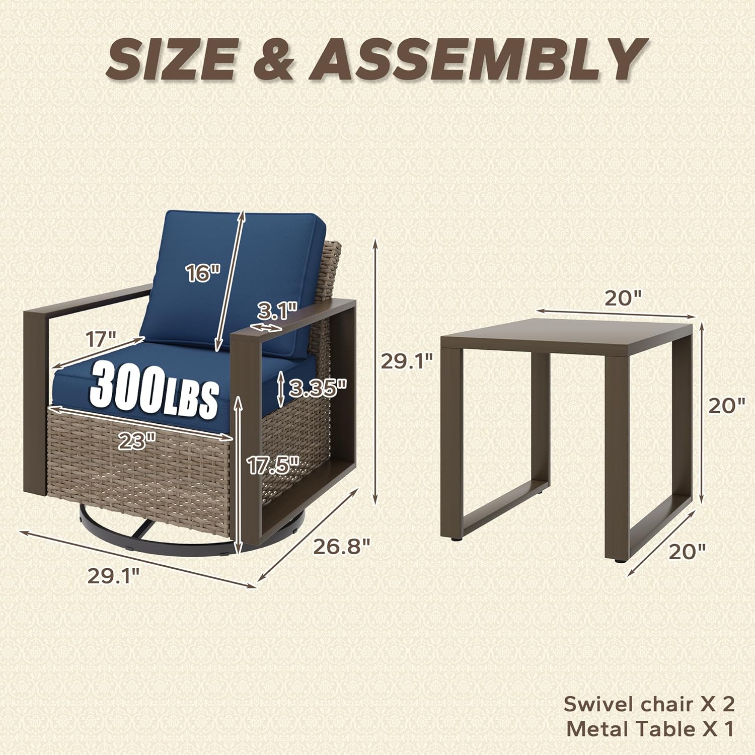- Size : 3 PCS Swivel Chairs Set