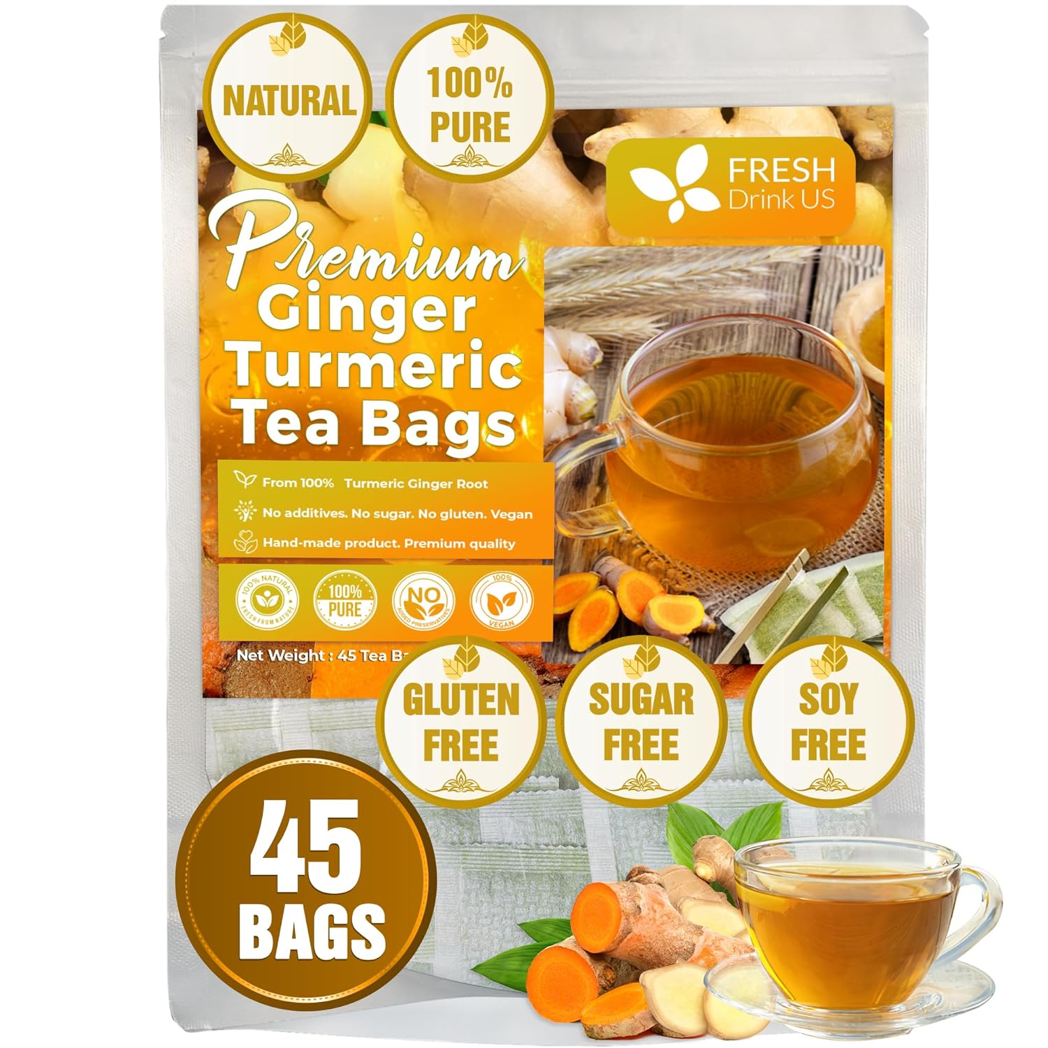 FreshDrinkUS, Premium 45 Ginger Turmeric Tea Bags, 100% Natural Ingredients, Hand-made Blend of Ginger and Turmeric Herbal Tea, Eco-conscious Tea Bags. No Sugar, No Caffeine, No Gluten, Vegan.