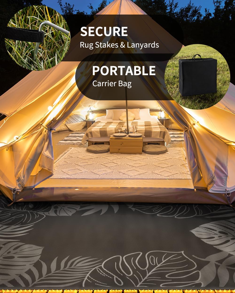 - RV traval&Camping: This camper must haves outdoor rug is ideal for picnics, gatherings, and RV trips! The lightweight outdoor camping carpet with foldable lines is easy to carry and saves space. Includes an extra carry bag and rug stakes for 6x9 ft, 8x10 ft and 9x12 ft. Grass-friendly, durable, and easy to clean, this outdoor rug enhances outdoor adventures.