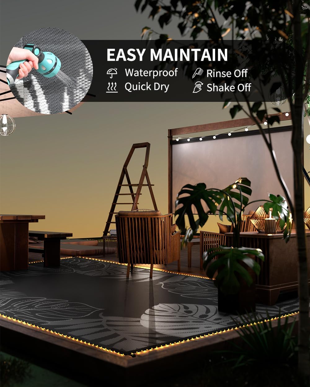 - Easy Clean&Quick Dry: Tightly woven patio rug designed to resist stains from beverages and food. Dirt and leaves can be easily wiped off or hosed down. Outdoor rug waterproof ensure quick drying, keeping your outdoor deck dry and free from unpleasant marks. This excellent outdoor patio rug allows you to spend more time enjoying life.