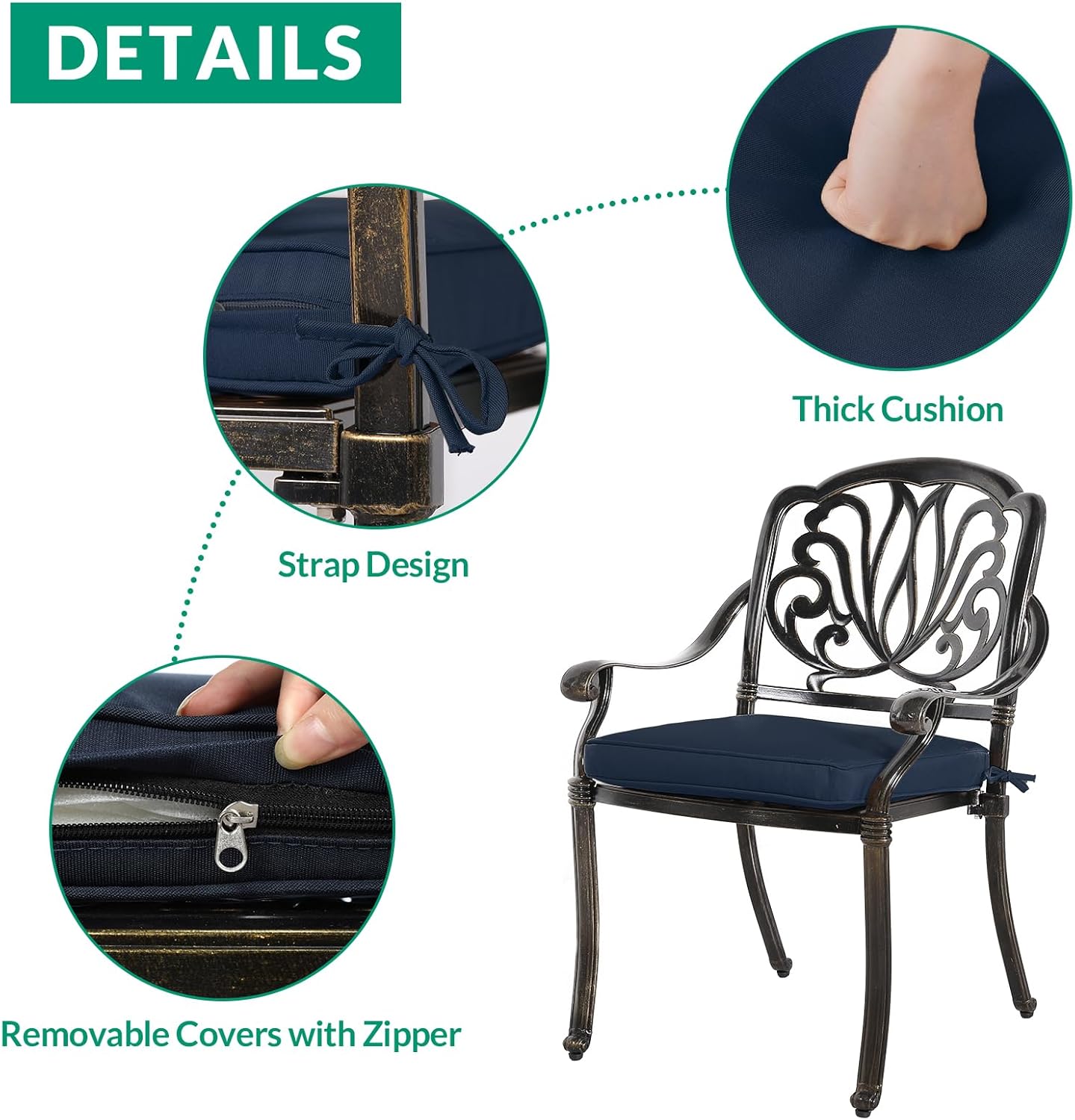 VIVIJASON 3-Piece Patio Furniture Dining Set, All-Weather Cast Aluminum Outdoor Bistro Set, Include 2 Chairs, 2 Cushions and 31" Round Table w/Umbrella Hole for Balcony, Backyard, Navy Blue Cushion
