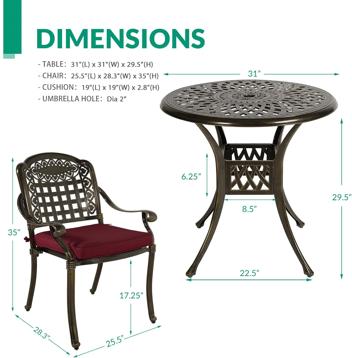- 【SET DIMENSIONS】 - Table Dimensions: Dia31"x 29.5"(H); Chair Dimensions: 25.5"(L) x 28.3"(W) x 35"(H); Cushion Dimensions: 19"(L) x 19"(W) x 2.8"(H); Umbrella hole: Dia 2"; Weight Capacity of Table: 165 lbs; Weight Capacity of Each Chair: 350 lbs.