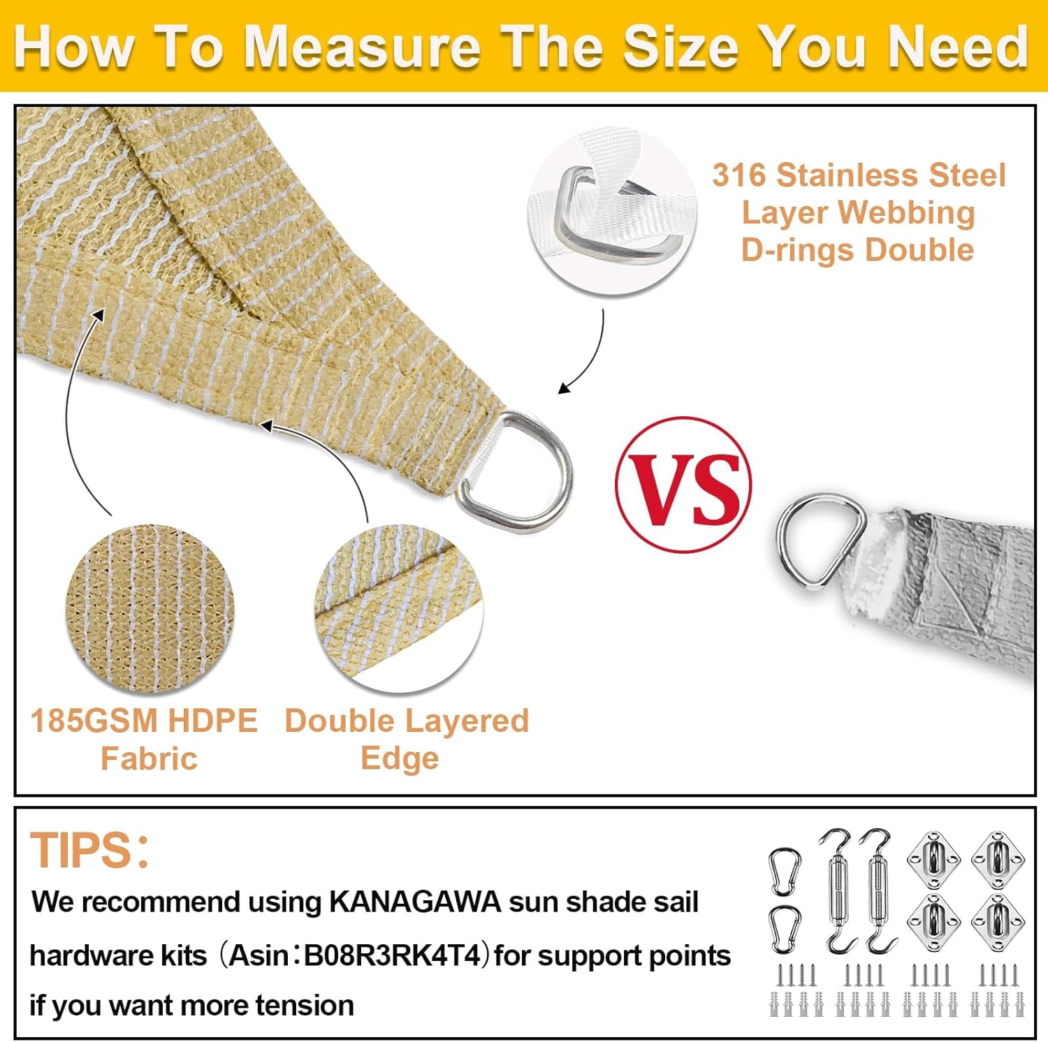 - High Quality Materials: Made of 100% brand new 185 GSM HDPE (high density polyethylene) material.Our sunshade sail is attached with DOUBLE layer webbing in each side and stainless steel D rings in corners to make the sun sail shades stronger and more durable