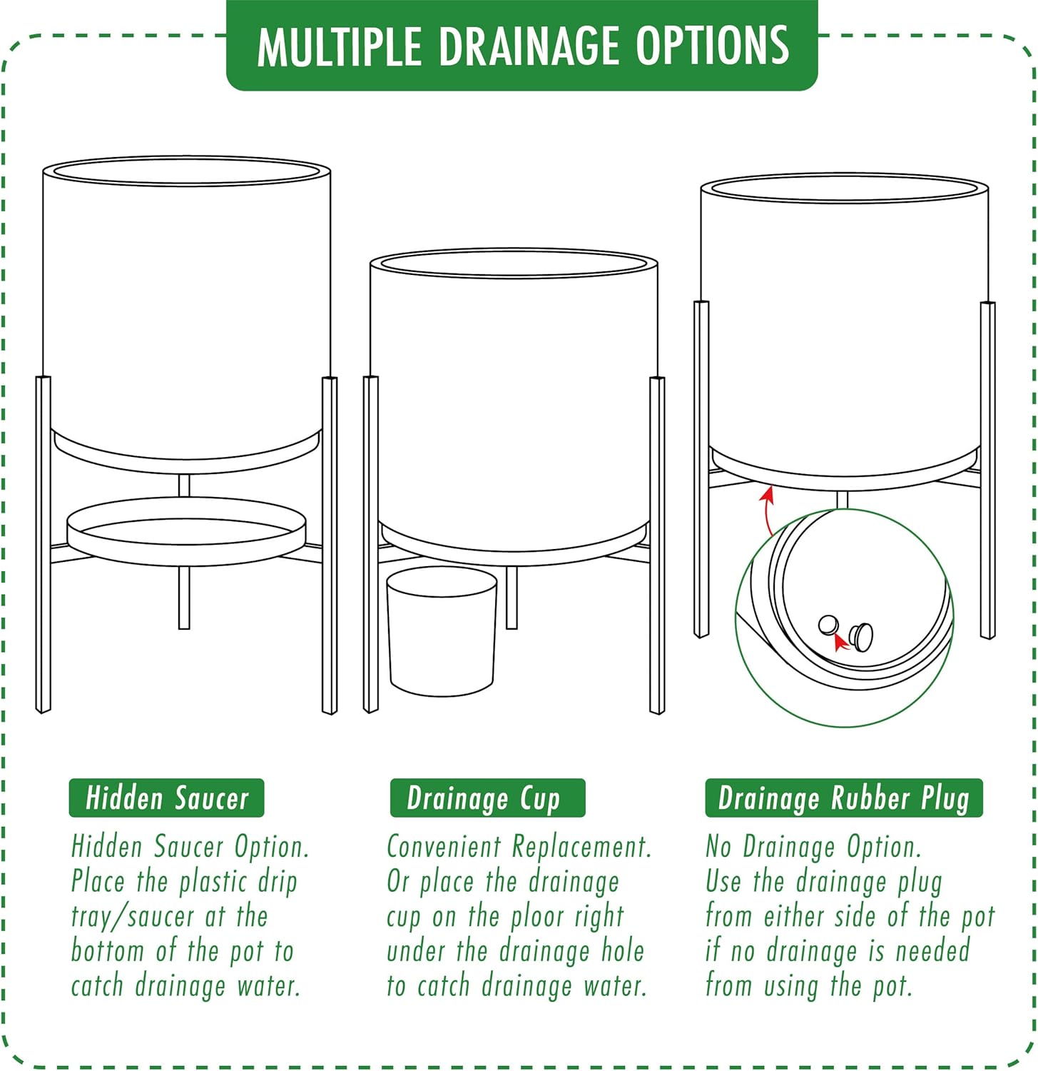 - Included: Planter pot with drainage hole, craftwork metal planter stand, mesh net, rubber plug, ceramic balls planter filler, drainage cup.