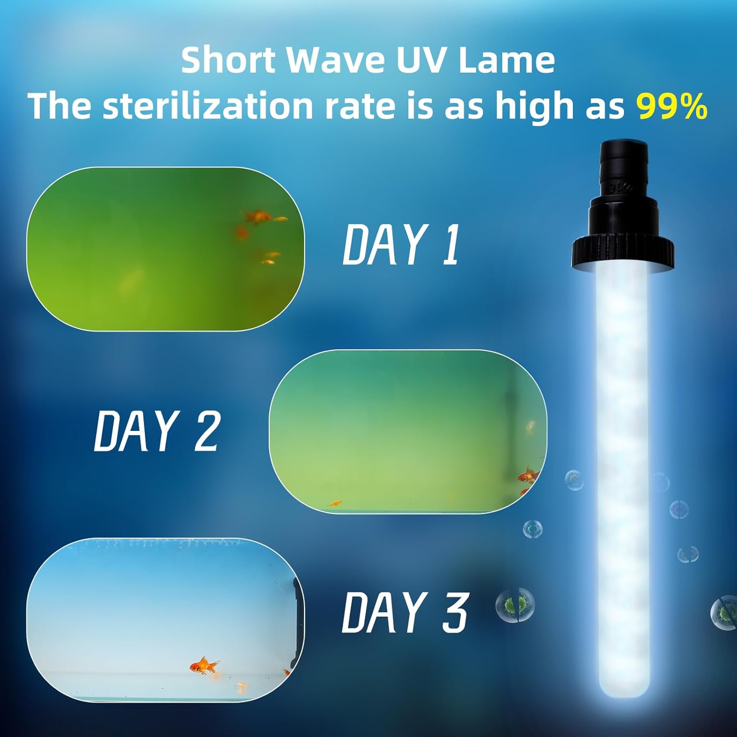 - 【99% Rate】The aquarium UV light utilizes 254nm short-wave UV/UVC germicidal lamps, boasting an efficient rate of 99%. It effectively eliminates green algae, ensuring crystal-clear water. The presence of ultraviolet lamps enhances the filtering effect beyond standard filtration.