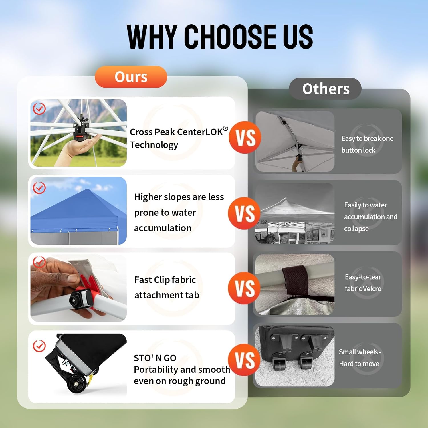- ENHANCED STRENGTH & STABILITY: Enhanced with patented 8-way center lock technology and thickened leg poles. (11.8" diameter), this canopy provides over 10'8" of interior height, ensuring stability in various weather conditions, suitable for commercial and recreational events.