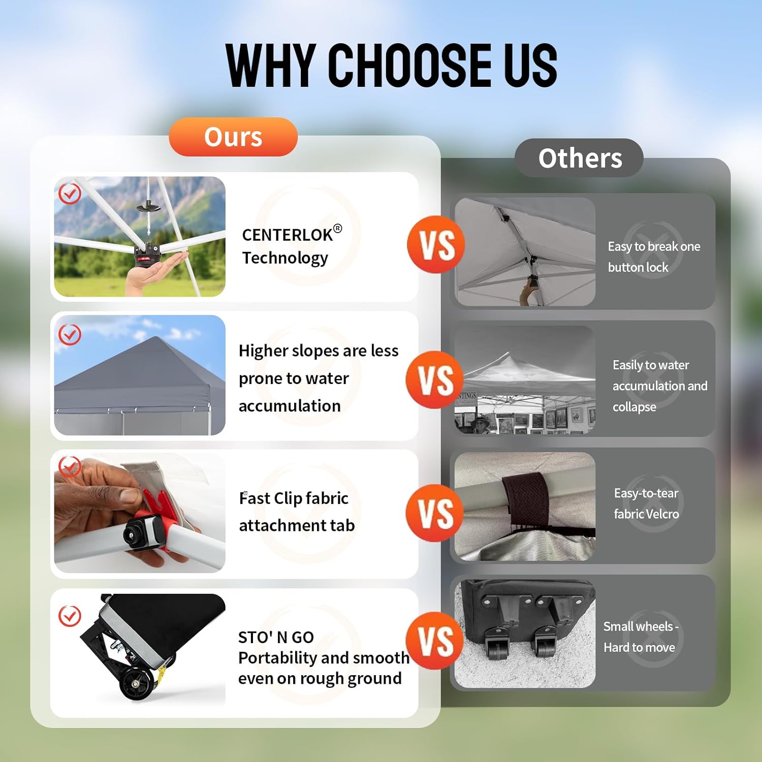 - PRIVACY AND PROTECTION- Four detachable side walls offer privacy and protection from wind and dust, ensuring shade and the security of your products. An easy-clip tech is utilized to secure the top cover and prevent the accumulation of water. The top cover fabric is made of 400D polyester with a coating, offering UPF 50+ UV protection, blocking 98% of UV rays, and meeting the CPAI-84 flame retardant standard. The top vent has been omitted to prevent leaks.