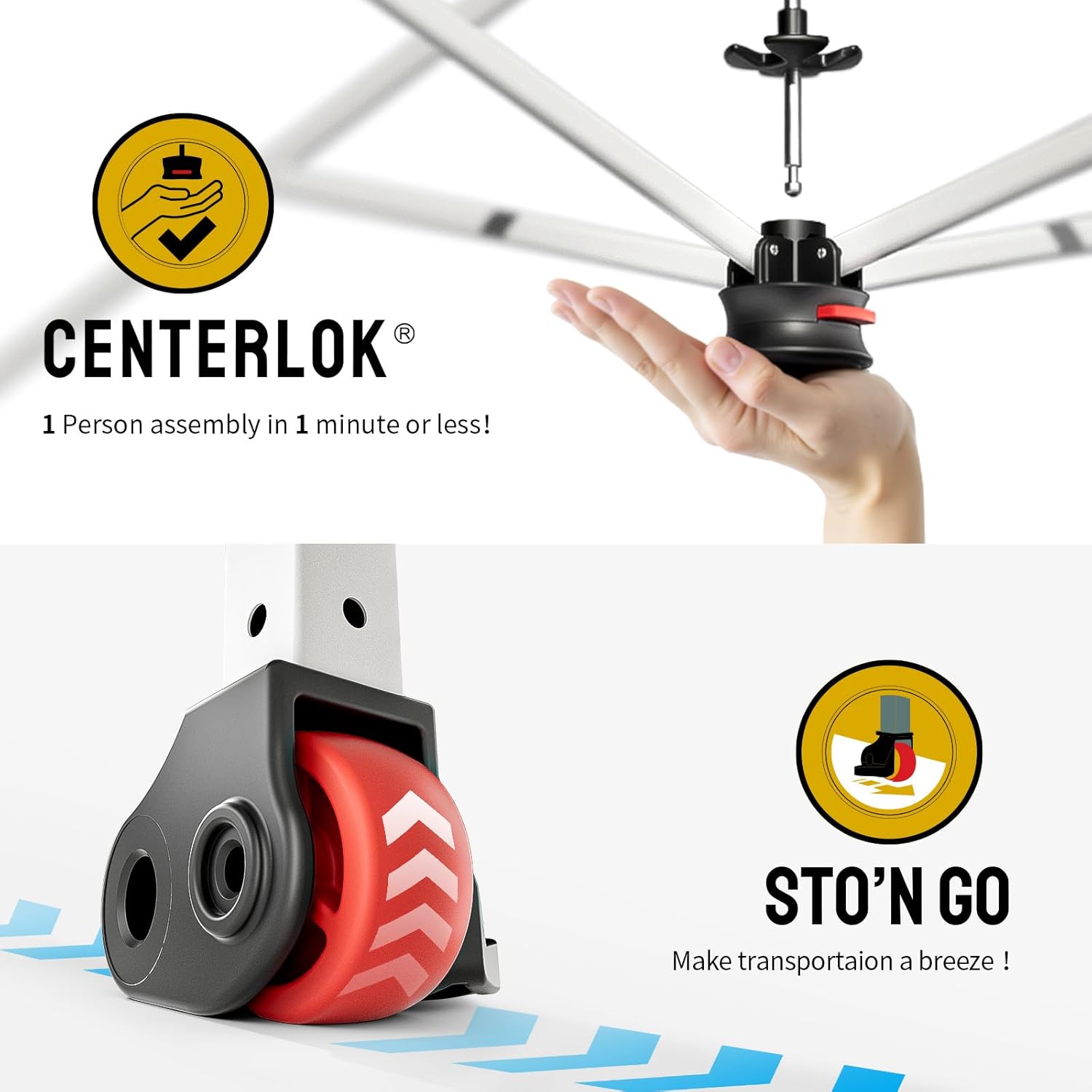 - STO’ N GO SYSTEM - Our lift-free system makes collapsing, storing, and transporting the 8x8 tent a breeze. The 8x8 tents can be stored with the fabric attached, with a specialized pocket for 4 sandbags, 8 stakes, and 4 guy ropes. Integrated wheels in the feet allow easy movement even when the instant shelter tent is set up, by simply lifting the side without wheels. This feature is especially useful for quick setup and takedown at locations like the patio or sports events