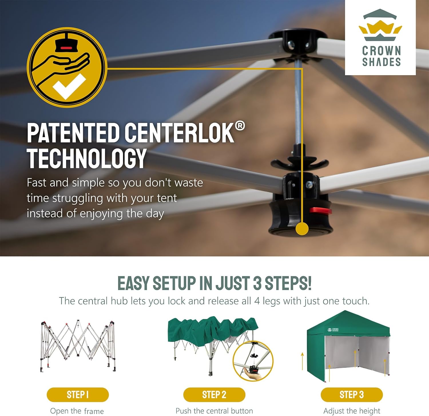 - [EASIEST SET UP]: The patented central lock technology allows you to lock all four legs with a single push at the center hub. The leg height can then be adjusted using soft, pinch-free buttons. The next-generation canopy has been designed for ease of use, allowing two people to set it up in a matter of seconds without the need for any tools.