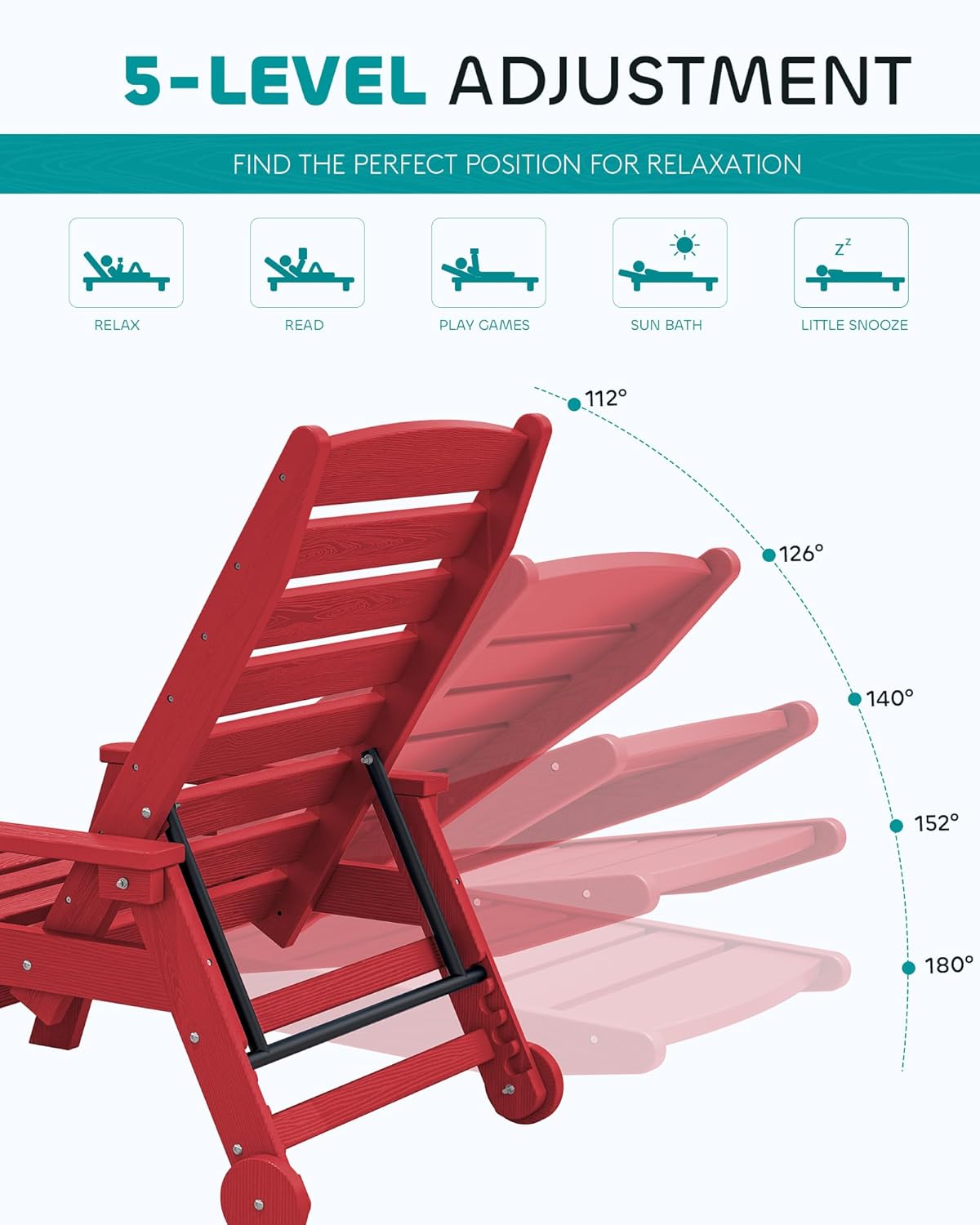 - Modern Stylish: Our HDPE adjustable patio lounge chair with wheels is available in a variety of colors, allowing you to choose one that complements your outdoor decor. Its modern design adds both comfort and practicality to any outdoor space.