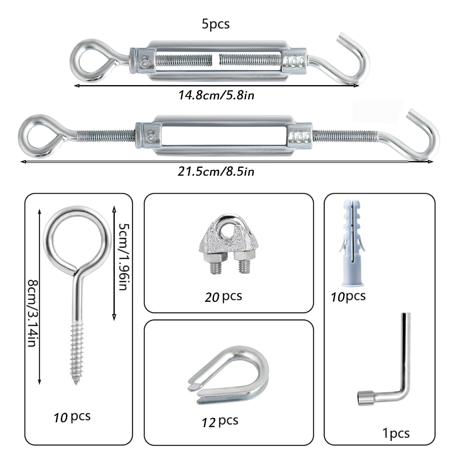 - 3/16" Cable Railing Kit: Package includes wire rope + complete accessories, which are a 100 ft steel cable, 5× M6 turnbuckle hooks and 10× eye screws, 20× U bolt saddle fastener, 12× steel cable thimbles, 10× expansion pipes, and 1 cable clamp screwdriver