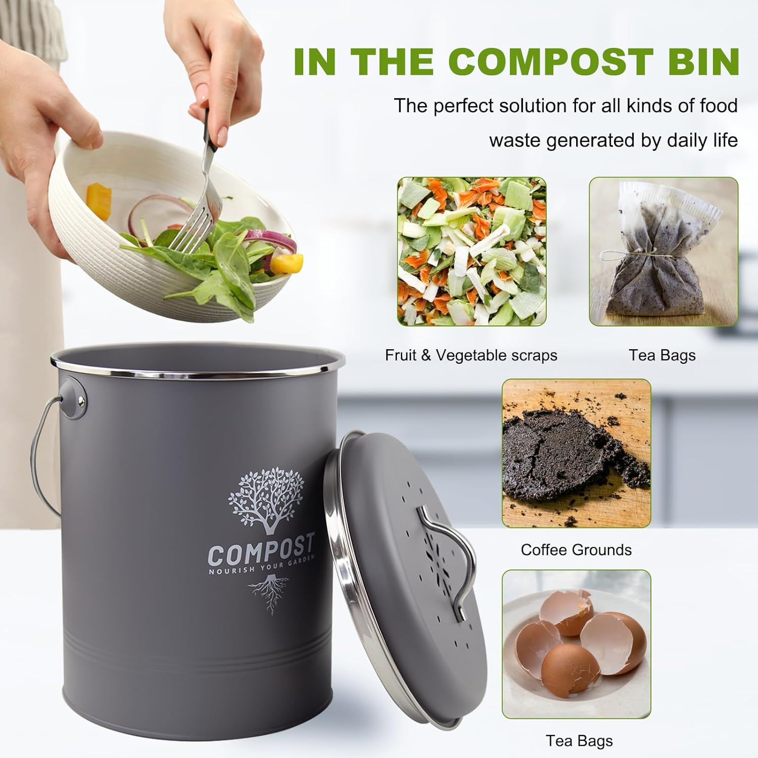 • PRACTICAL: This kitchen essential allows you to easily compost food waste indoors, reducing waste generation and promoting a sustainable home environment. The kitchen food waste produced by kitchen composter can be converted into nutrient-rich fertilizer for your garden, which can promote healthy plant growth and support the sustainability of your gardening activities.