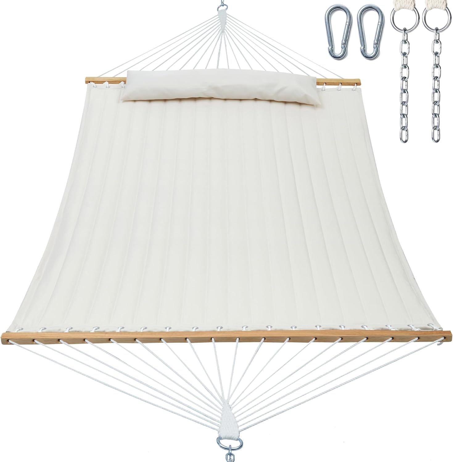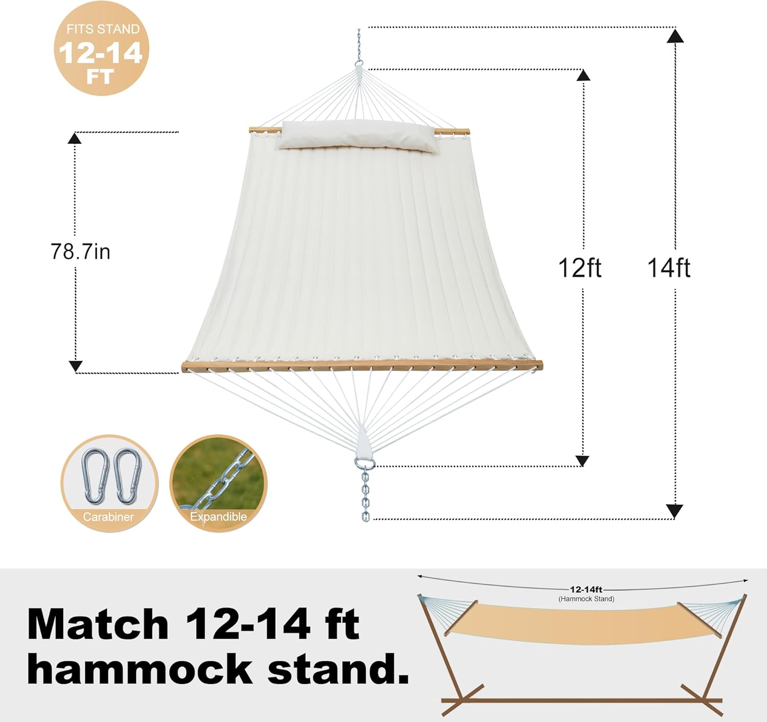 Double Quilted Fabric Hammock with Spreader Bar, Fit 12-14ft Hammock Stand, 2 Person 14ft Hammocks for Outside, Large Removable Pillow Storage Bag, Carabiners, Max 475 lbs Capacity (Beige)